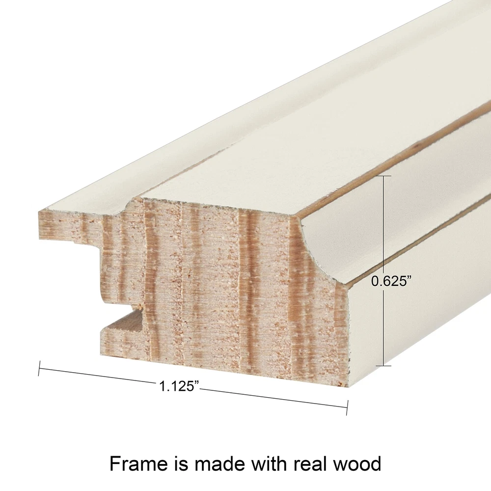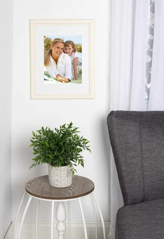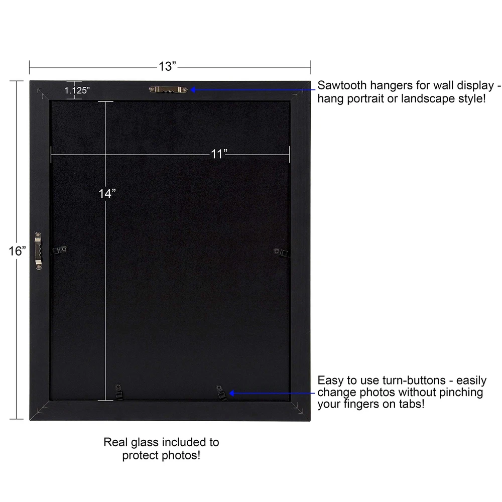 These classic solid wood frames are the perfect addition to your existing home decor. Available in different colors and standard sizes, these traditional frames will display all your treasured memories. Each frame has solid wood construction, a satin finish, and a detail of distressing on the profile. Each picture frame in the set holds photo horizontally or vertically securely with protective glass and a slide in turn key back. The wood frame profile measures 1.2 inches wide and 0.6 inches deep. Decorative wood picture frames hold an 8x10 photo with the included mat or 11x14 without the mat Solid wood photo frames can be displayed horizontally or vertically; Glass is included in all frames Wall display dimensions for each frame are 13 inches by 16 inches by 0.75 inch depth Metal hangers for easy wall display are already attached to each frame Frame profile is constructed of solid wood and measures 1.2 inches wide and 0.6 inches deep