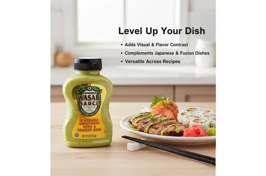 New Kikkoman Wasabi Sauce adds a little spice and a lot of creamy texture to everyday foods. Turn up the heat on vegetables and sandwiches, put more zing in steaks, burgers, chicken and fish, or add fire to dips and salad dressings. Pasteurized and produced in the USA, Kikkoman Wasabi Sauce is made to the highest standards of quality that consumers have come to expect from Kikkoman