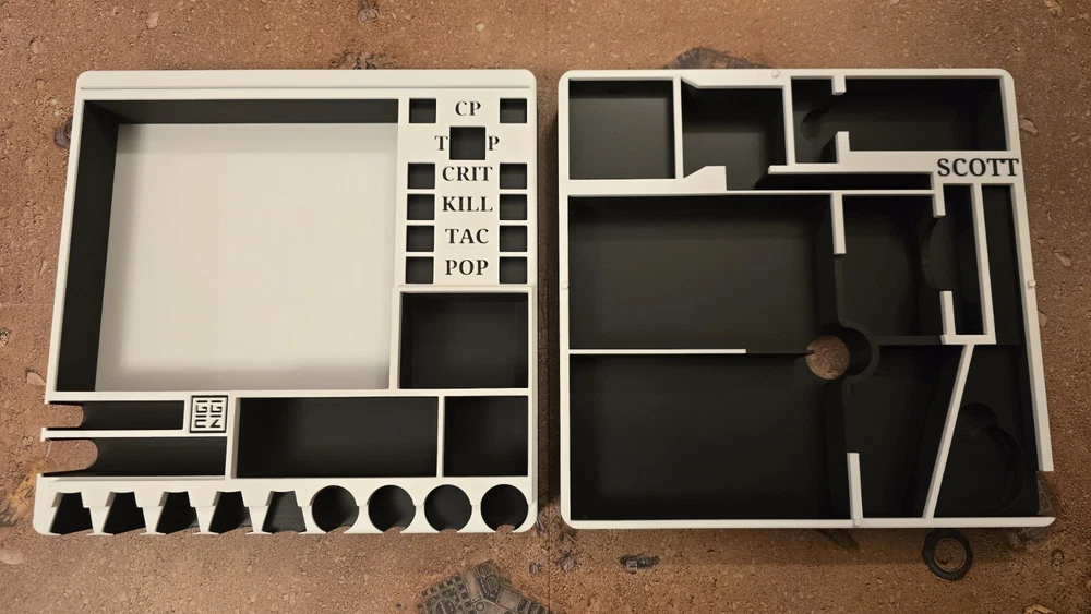 This item is perfect for any Kill Team player that wants to only take one box that carries everything they need. This will fit inside the 4L Really Useful Box so that you use the remaining space for your Kill Team whilst the box will house everything else needed to play a game, with the exception of the terrain. This box will fit all the tokens that are come bundled with the Kill Team Starter Set as well as all the equipment in the Kill Team Equipment upgrade pack. The bottom has two slots that fit tarot sized kill team cards. Both with and without sleeves. There is also a circle cut out for large custom objective markers. There are several extra spaces for whatever else you may wish to include. I also include a removable card divider if you wish to fit more cards in the dice tray. It may also fit in other boxes that are designed for A4 paper but please check the below dimensions of the box with the Support bar that stops the box from sliding. Box - L:215 W:220 H:65 Box with Support Bar - L:215 W:348 H:65 The support bar will come in two pieces that you will need to push together, then slide into the opposite corners of your Really Useful Box. This does not come with any items that are inside the token box. The current items in there are for display purposes to show what goes in. You will also need to obtain your own Really Useful Box, preferably with ferrous sheets, so your models can use magnets to stick in the box. I do not recommend magnetic sheets as they do not generate a strong pull for other magnets, where ferrous sheets do even though they aren't magnetic themselves. This box is 3D printed, and small visual imperfections may occur with your print. Please make sure to thoroughly test your the printed box in your Really Useful box with the U bar to make sure it doesn't slide before you put any models in.