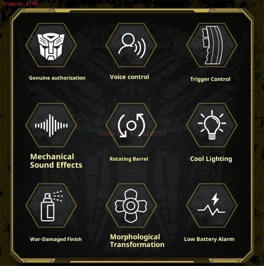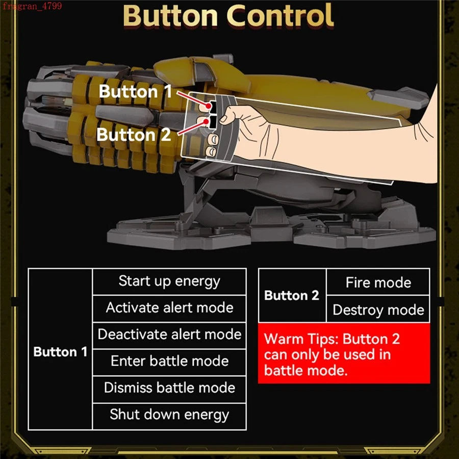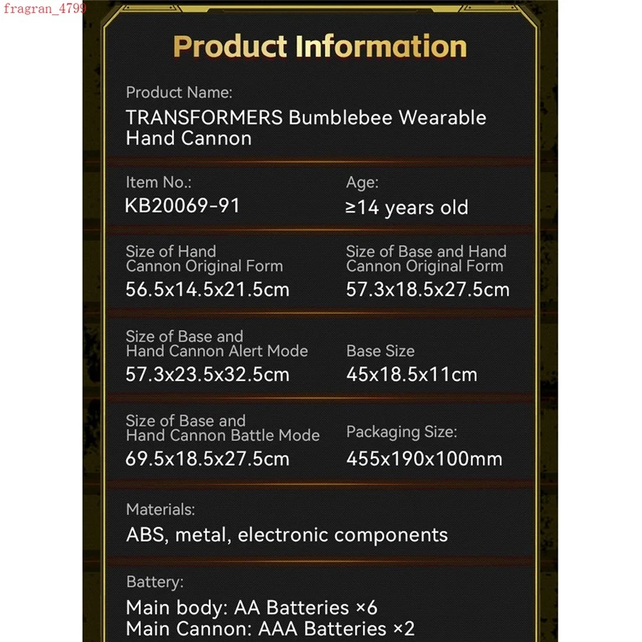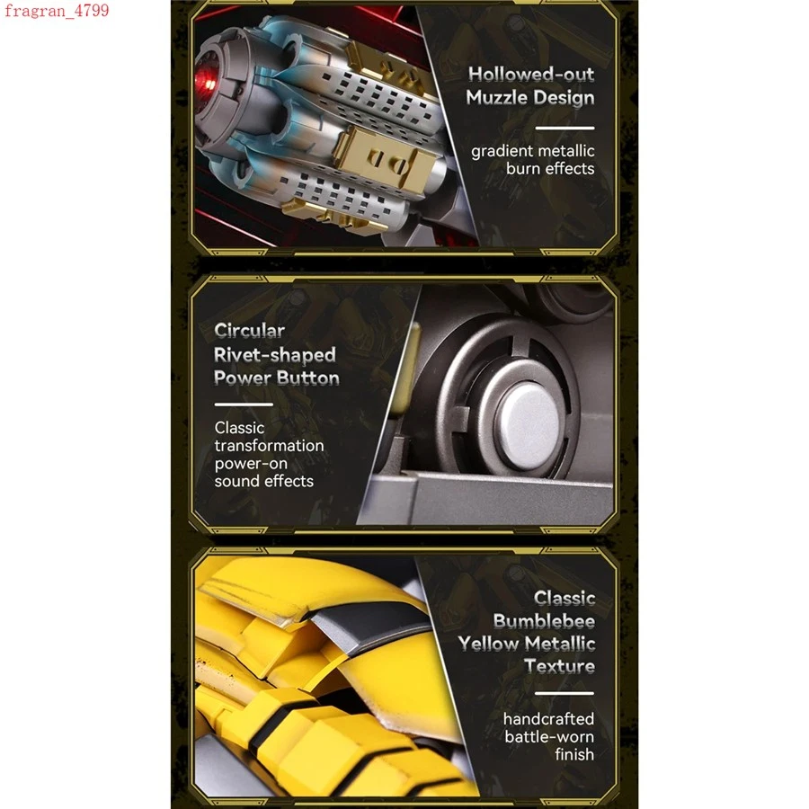 Feature: Dual-Language Voice Control (Chinese/English), Button Trigger Manual Control, Cool Red-Blue Energy Ambient Lighting. Gatling Continuous Firing Sound Effects, Main Cannon Rotating Red Light Blast, Full Firepower Mode. Extendable/Retractable/Rotatable Barrels, Six-Claw Muzzle Opens/Closes on Command, Top Cover Opens with Sound Effects. Classic Bumblebee Yellow Metallic Paint Finish, Hand-Painted Weathering/Battle Damage Effects, Synchronized with Helmet Commands. Hand Cannon Original Form Dimensions: 56.5×14.5×21.5 cm. Base + Hand Cannon Original Form Dimensions: 57.3×18.5×27.5 cm. Base + Hand Cannon Alert Mode: 57.3×23.5×32.5 cm. Base Only: 45×18.5×11 cm. Base + Hand Cannon Extended Battle Mode Dimensions: 69.5×18.5×27.5 cm. Packaging Dimensions: 455×190×100 mm. Killerbody Transformers Bumblebee Hand Cannon 1:1 Wearable Voice Control ToyGift Killerbody Transformers Bumblebee Hand Cannon 1:1 Wearable Voice Control Toy Gift Feature: Dual-Language Voice Control (Chinese/English), Button Trigger Manual Control, Cool Red-Blue Energy Ambient Lighting. Gatling Continuous Firing Sound Effects, Main Cannon Rotating Red Light Blast, Full Firepower Mode. Extendable/Retractable/Rotatable Barrels, Six-Claw Muzzle Opens/Closes on Command, Top Cover Opens with Sound Effects. Classic Bumblebee Yellow Metallic Paint Finish, Hand-Painted Weathering/Battle Damage Effects, Synchronized with Helmet Commands. Hand Cannon Original Form Dimensions: 56.5×14.5×21.5 cm. Base + Hand Cannon Original Form Dimensions: 57.3×18.5×27.5 cm. Base + Hand Cannon Alert Mode: 57.3×23.5×32.5 cm. Base Only: 45×18.5×11 cm. Base + Hand Cannon Extended Battle Mode Dimensions: 69.5×18.5×27.5 cm. Packaging Dimensions: 455×190×100 mm. Note: 1. Hand measurement will have discrepancy of about 1-2cm. 2. The photos are all taken from physical objects, but due to different monitors, there may be slight differences between the actual object and the image. Payment Payment ★ We accept any credit card or bank card by PayPal Payment and Bank Draft. (Don't accept private check). ★We provide the fast shipping and US Direct Mail!
