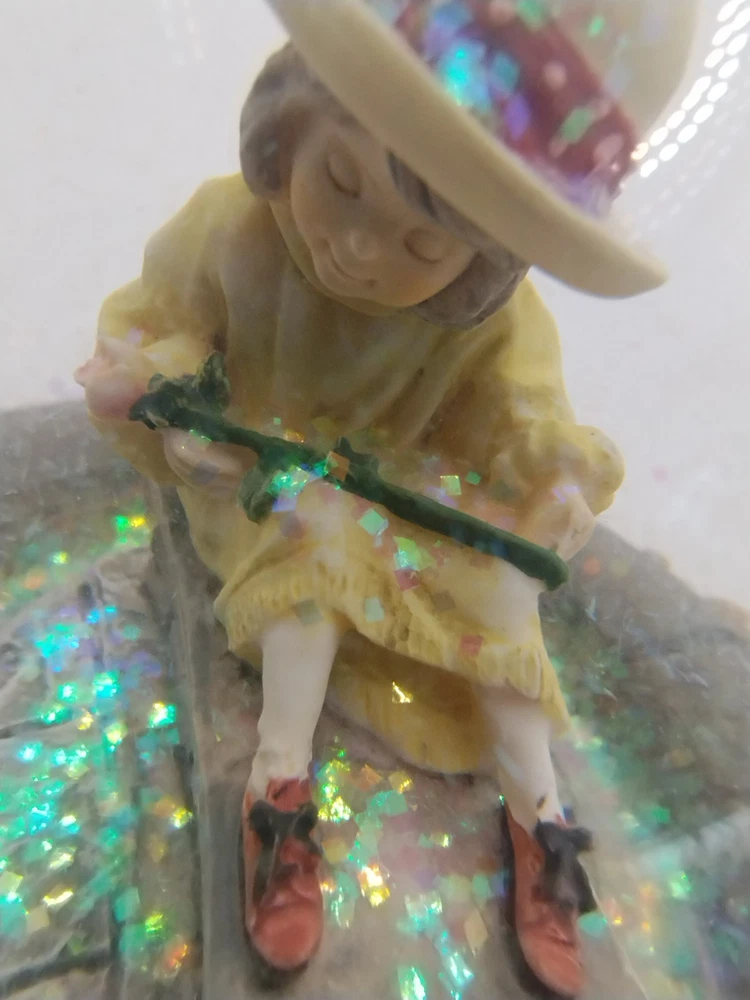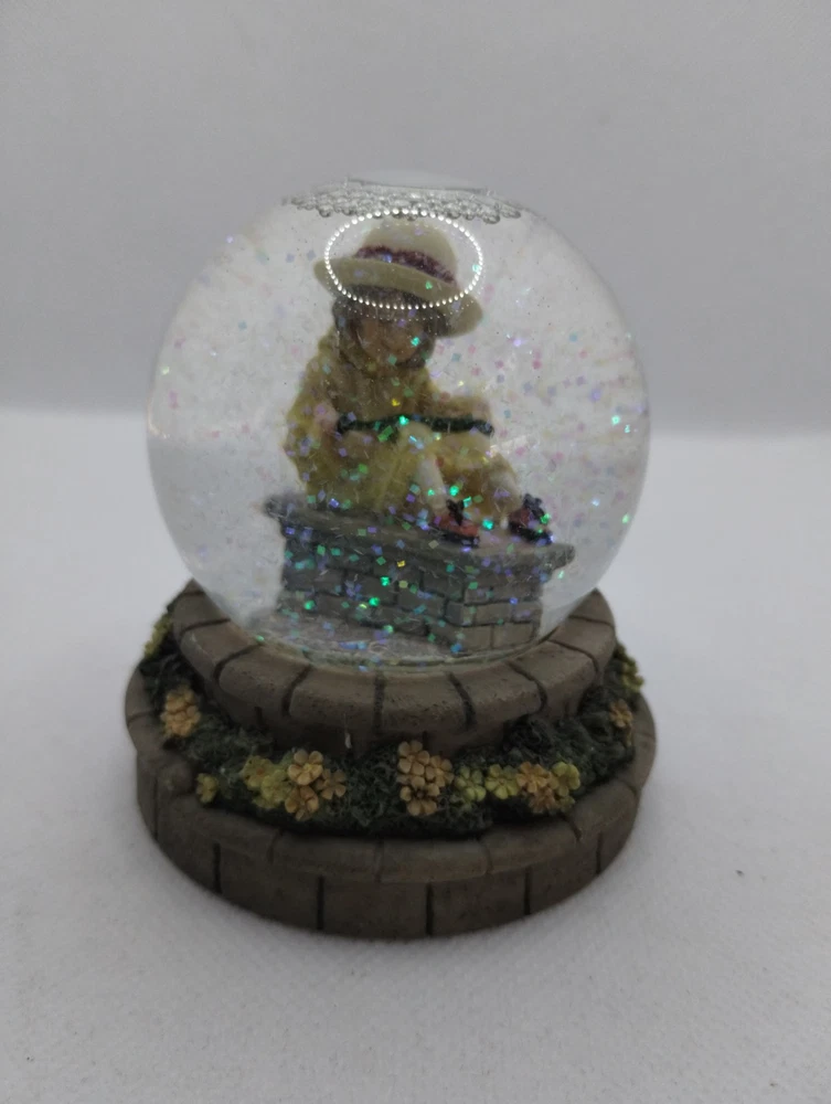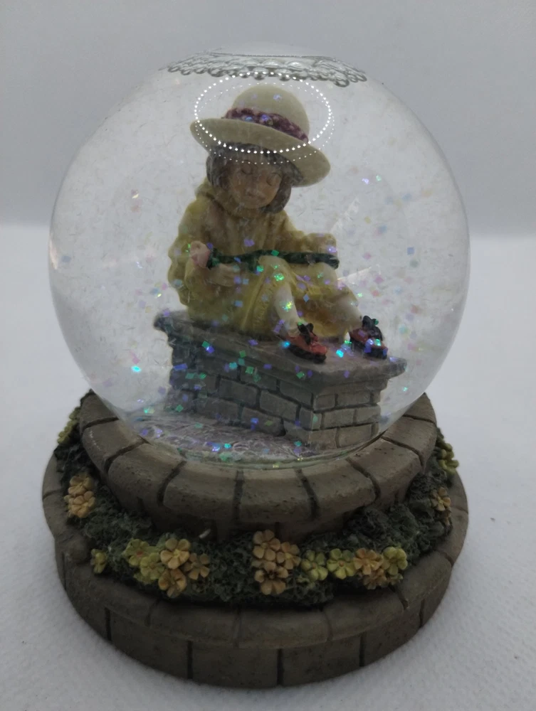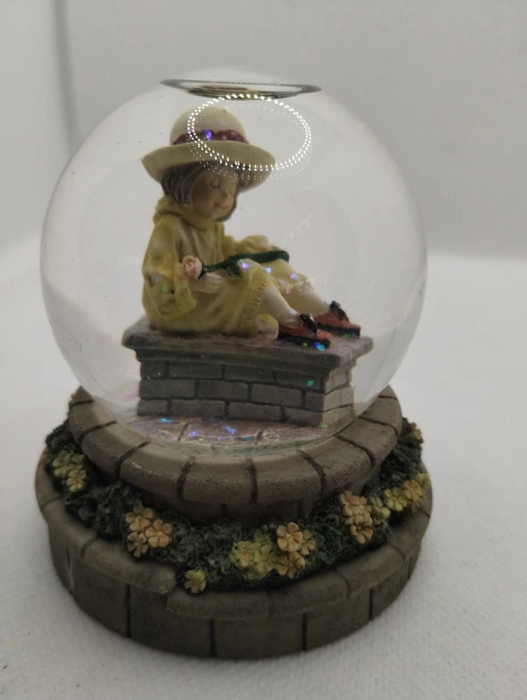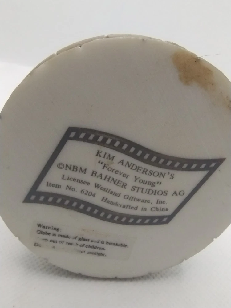 This handcrafted snow globe features a round shape with a small size, measuring 4.25 inches in length and 3 inches in width. It contains water as the fill material and is adorned with crystals, giving it a romantic and nostalgic feel reminiscent of the 1970s era. The globe showcases a scene of a girl in a snow-covered setting, part of the "Forever Young" collection by Kim Anderson. This licensed reproduction from Westland Giftware is a charming piece that captures a sense of innocence and youthfulness.