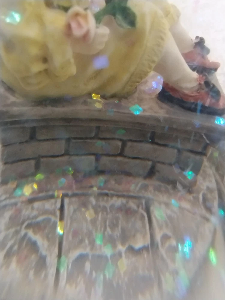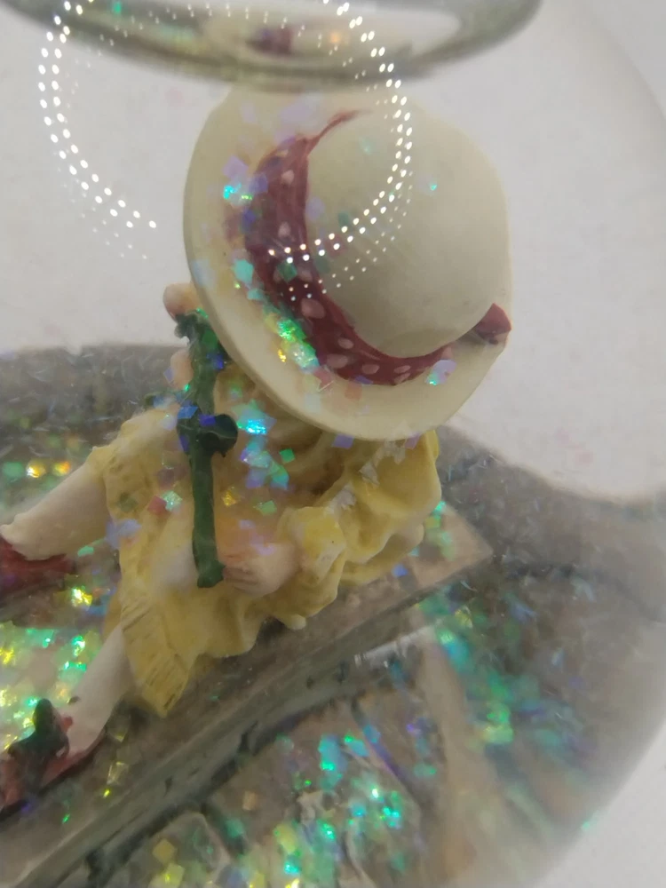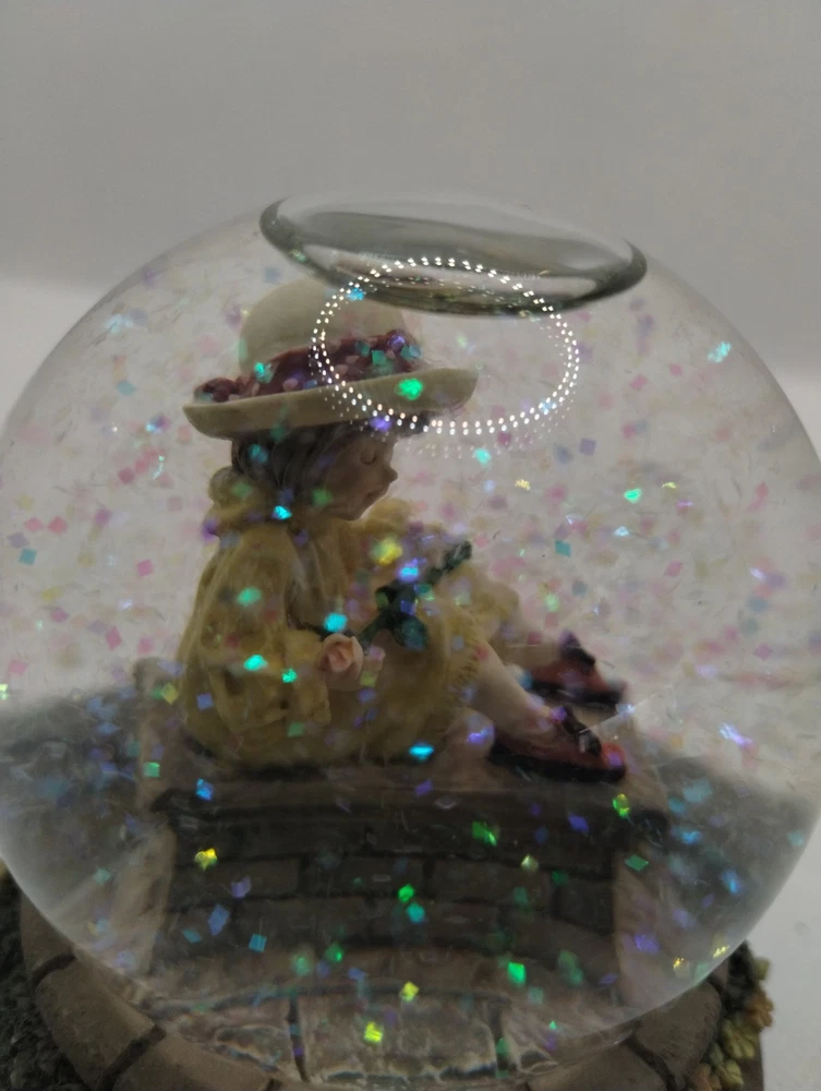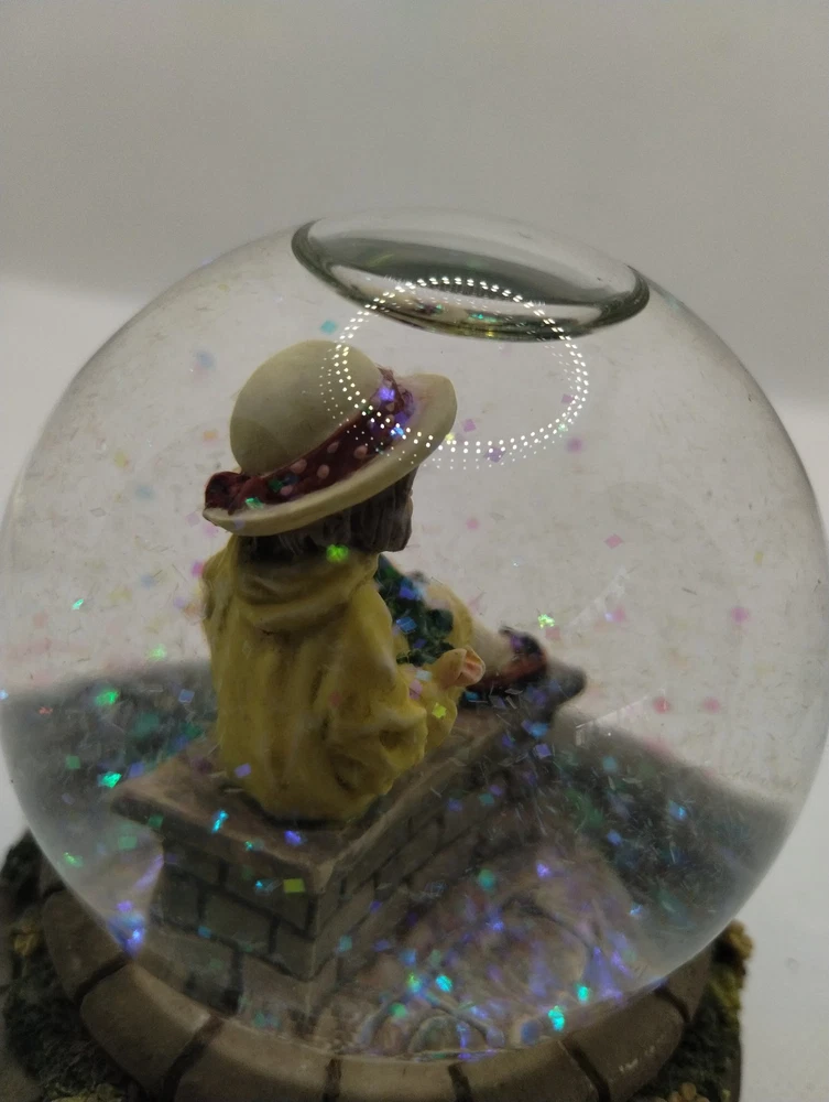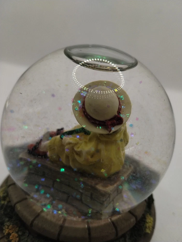 This handcrafted snow globe features a round shape with a small size, measuring 4.25 inches in length and 3 inches in width. It contains water as the fill material and is adorned with crystals, giving it a romantic and nostalgic feel reminiscent of the 1970s era. The globe showcases a scene of a girl in a snow-covered setting, part of the "Forever Young" collection by Kim Anderson. This licensed reproduction from Westland Giftware is a charming piece that captures a sense of innocence and youthfulness.