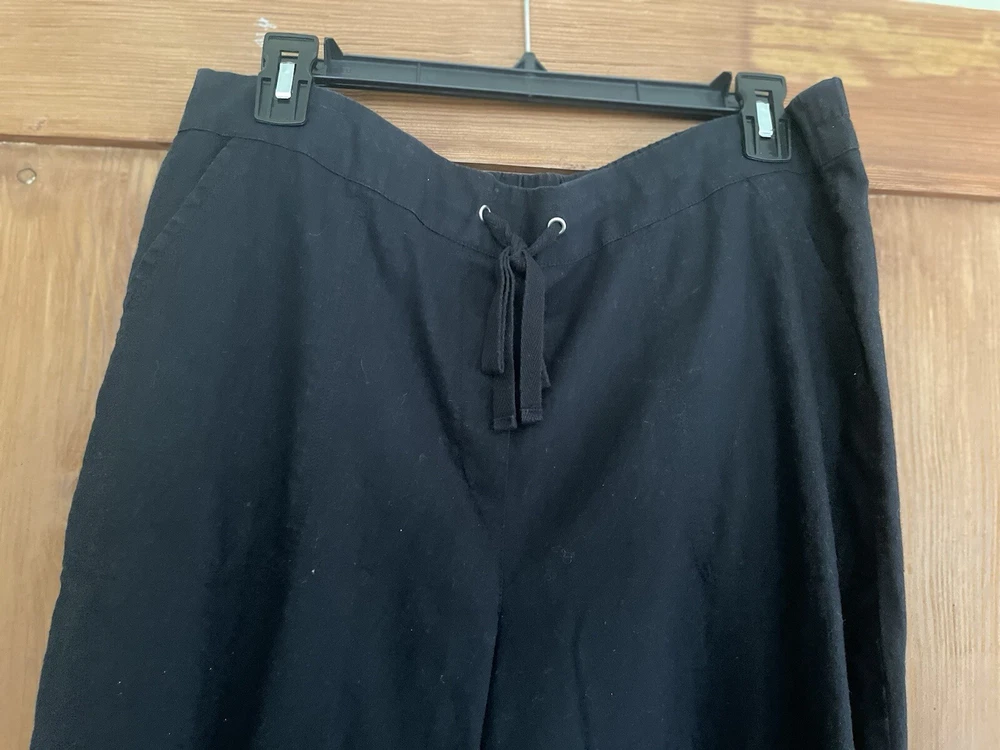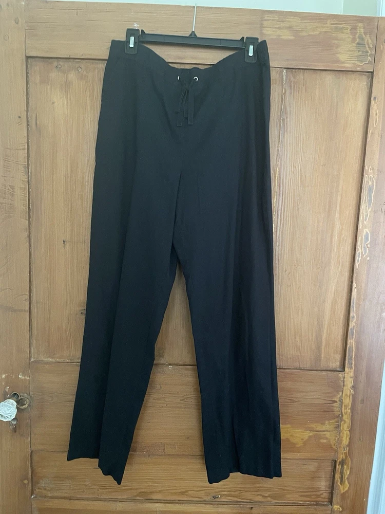 Kim Rogers black pants. Size medium. Flat front. Drawstring waist with elastic. Front pockets. Straight leg. Cotton linen blend. Machine wash. Excellent condition. Waist 35 inches Stride 11.5 inches Inseam 30 inches