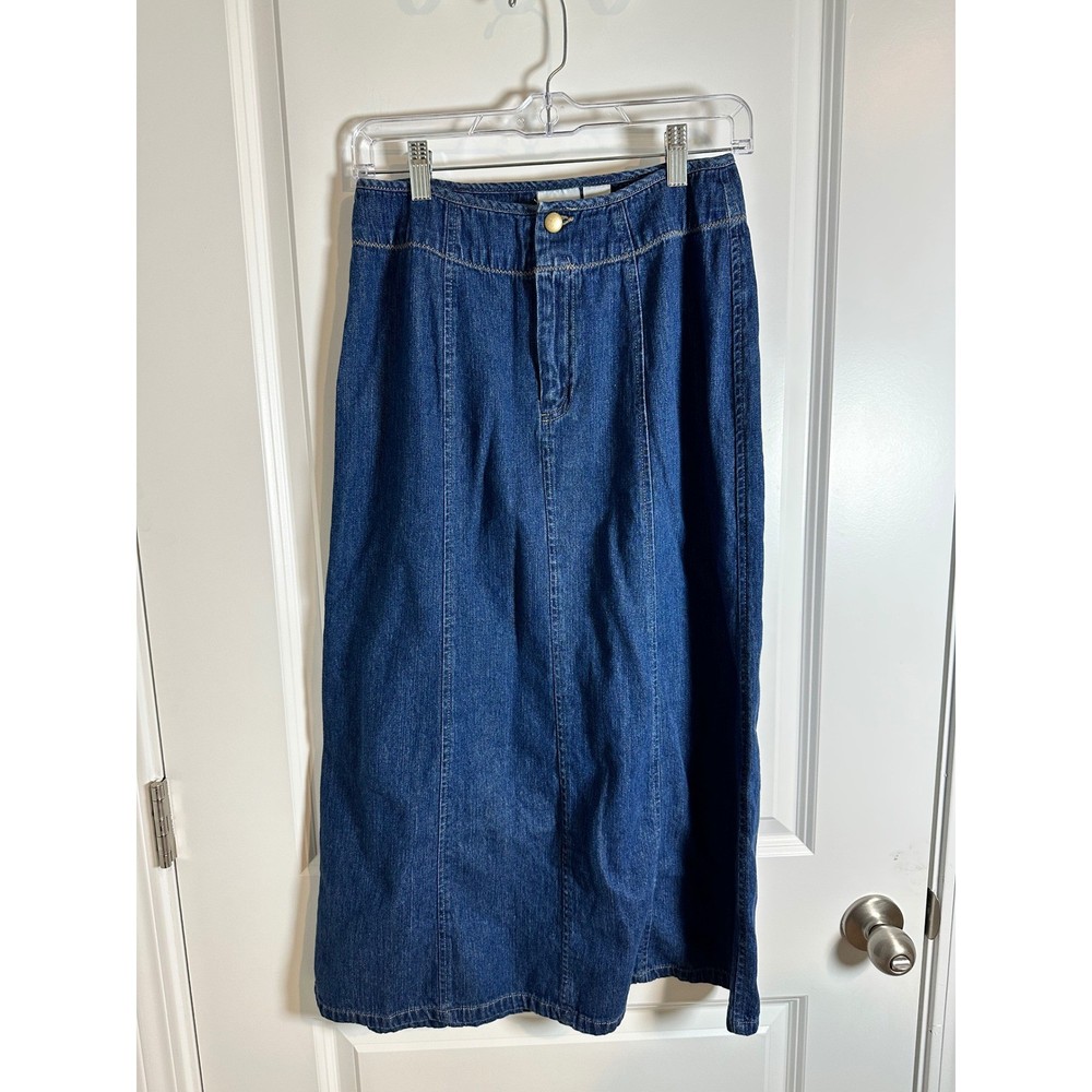Classic denim maxi skirt in a timeless blue wash. A streamlined silhouette, crafted with vertical paneling, enhances the skirt's flowing lines and provides a flattering fit. The design features a comfortable waist and a full-length cut, making it a versatile piece for effortless styling. This skirt is perfect for weekend outings, casual brunches, or relaxed evenings. Type: Skirt Style: Maxi Skirt Length: Long Color: Blue Department: Women Pattern: Solid Material: Cotton Accents: Button Fabric Type: Denim Features: Lightweight, Stretch Character: Classic, Casual Closure: Button Occasion: Casual, Travel Keywords: denim maxi skirt, blue jean skirt, long denim skirt, petite denim skirt, casual skirt, women's skirt, Kim Rogers, 6P, denim, maxi, skirt, blue, jean, cotton, classic