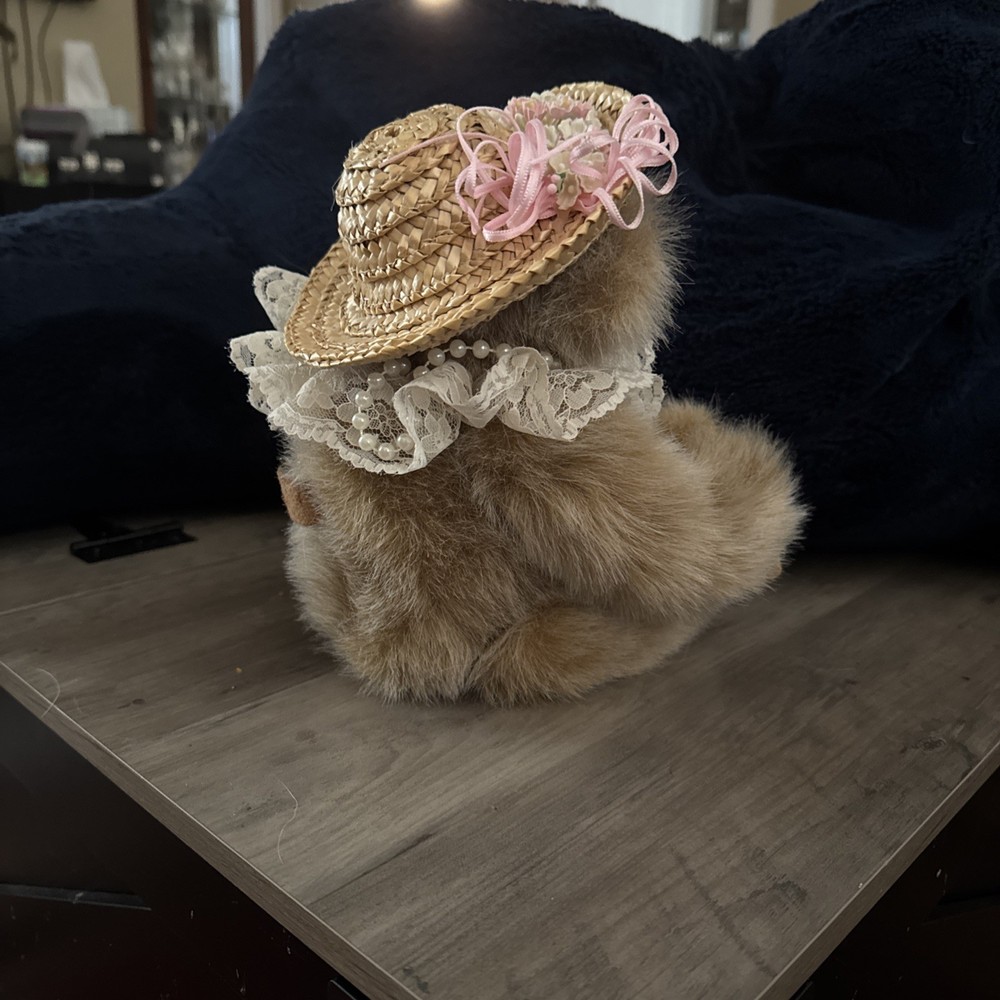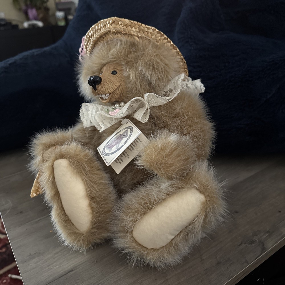 Kimberly Hunt's Kimbearly's Originals Plush Bear "Rose" is a beautifully crafted teddy bear with a carved resin face and jointed limbs. Standing at 11 inches tall, this unique bear features a black eye, light brown fur, and comes with a faux pearl necklace. The bear is part of the Kimbearly's Originals franchise, making it a collector's item that would make a perfect gift for all occasions. Made with plush material, this original teddy bear is a charming piece for any teddy bear enthusiast.