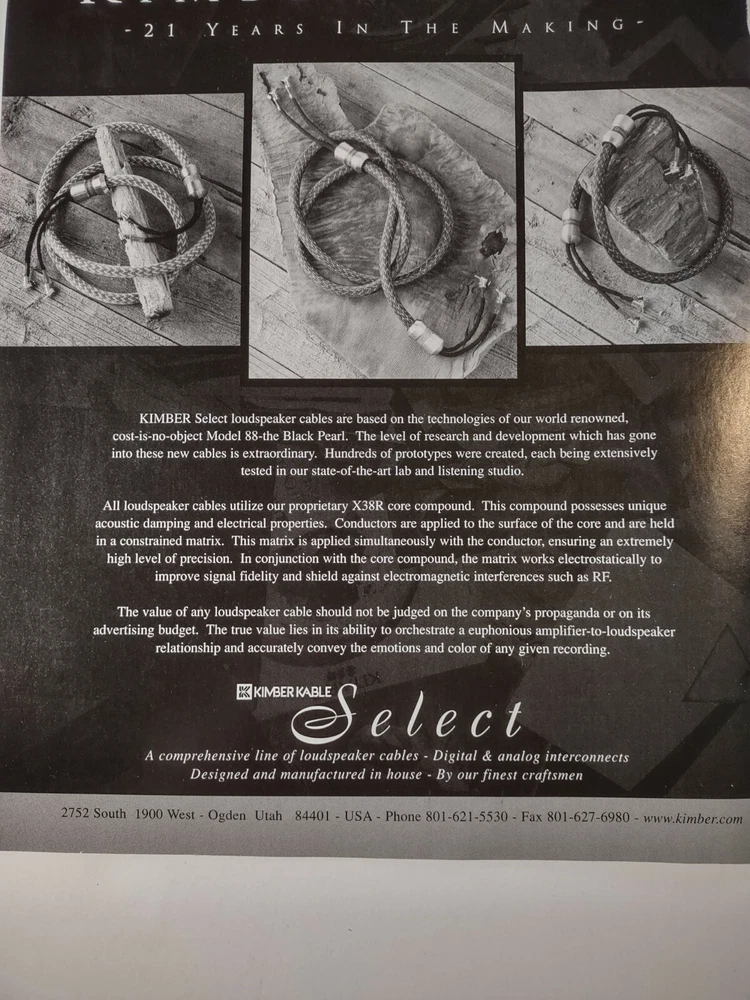 Kimber Kable Select 21 Years in the Making Loudspeaker Cables Vintage Print Ad Vintage ads are nostalgic ephemera items that serve a variety of purposes, such as: Framed art Nostalgic gifts that remind us of special times, places, or items in the past Scrapbook, junk journal, and art journal materials Vision board inspiration Collectable items that can easily be stored in sheet-protected binders! Shipped with care, bagged and boarded. Be sure to see our many others and more to come in our store at Dream of the Past. https://www.ebay.com/str/dreamofthepast We are a trusted seller, check our feedback on our sister eBay store Robin's General Store, where we have been selling since 2009. Discounts on purchases of multiples with greatly reduced shipping cost.