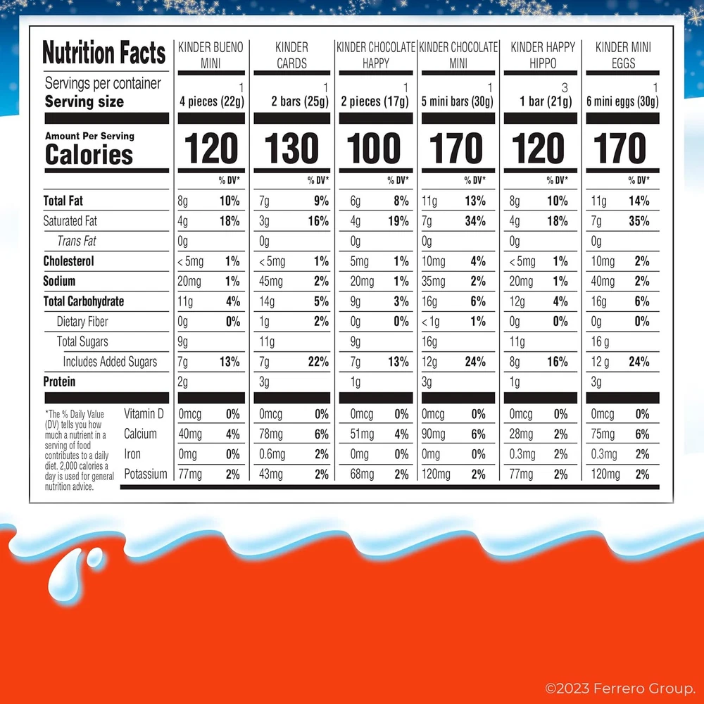 Kinder Holiday 2024 Advent Calendar, 24 Individually Wrapped Pieces, Blue Product Details Product Dimensions : 11.06 x 1.18 x 19.09 inches; 7.16 ounces UPC : 009800520299 Manufacturer : Ferrero Brand: Kinder Joy Color: Blue Theme: Christmas Age Range (Description): Kid Format: Advent Calendar KINDER HOLIDAY MIX COUNTDOWN CALENDAR: Share the magic of the holidays with this 24-piece Kinder Holiday 2024 Advent Calendar—this 6.9-ounce box makes the perfect holiday gift for all this season HOLIDAY COUNTDOWN: Count down to the holidays with seasonal graphics on a holiday house with 24 windows, each containing a different crispy or creamy Kinder holiday chocolate treat. CHOCOLATE GIFT: Discover assorted, individually wrapped Kinder milk chocolate and crispy wafer treats: Kinder Happy Hippo, Kinder Bueno Minis, Kinder Chocolate Minis, Kinder Schokobons, Kinder Cards and Kinder Chocolate Mini Eggs PERSONAL MESSAGE FROM SANTA: Create even more magical memories this season with the Portable North Pole app. Parents can send personalized messages from Santa to their children all season long SO MANY TREATS: Try our wide variety of delicious chocolatey treats. Made with no artificial colors or preservatives. Count down to the holidays with a seasonal exclusive assortment of 24 delicious Kinder holiday chocolates. A great holiday gift, the 2024 Kinder Holiday Mix Countdown Calendar is filled with Kinder Happy Hippo, Kinder Bueno Minis, Kinder Chocolate Minis, Kinder Schokobons, Kinder Cards and Kinder Chocolate Mini Eggs. Kinder Bueno Minis are a smooth milk chocolate with a dark chocolate drizzle covering a crispy wafer with a creamy hazelnut filling. The Kinder Card features 2 crispy wafers with a delicious creamy milky filling. Kinder Schokobons are smooth milk chocolate with a creamy milk and hazelnut filling with bits of hazelnut. Kinder Chocolate Minis are milk chocolate with a delicious, creamy, milky filling. Kinder Happy Hippos is a crispy wafer with a milk and cocoa filling. While, Kinder Mini Eggs have a smooth milk chocolate and creamy milk filling. Have an enjoyable holiday countdown with a sweet treat every day in December. This advent calendar for kids will bring the joy of the season to life. Parents love Kinder treats because there are no artificial colors or preservatives used. Plus, add even more magic to the season with the Portable North Pole app that lets parents create and send personalized messages from Santa to their children all season long.