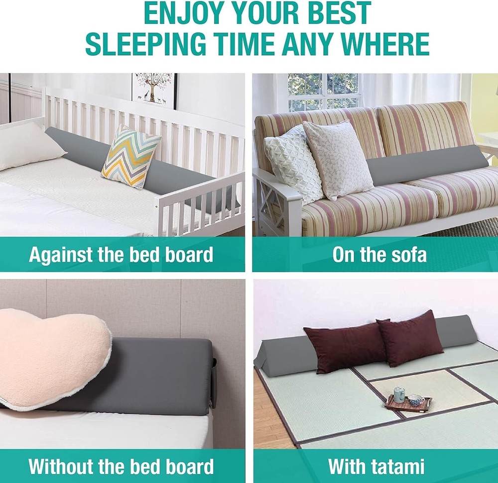 King Bed Wedge Pillow/Headboard Pillow Wedge/Mattress Gap Filler Wedge,Bed Gap Pillow Close Gap 0-6",Stop Pillow Falling Down-Gray 75in Long CLOSE The Bed Gap - This mattress gap filler close the gap between your headboard or wall and mattress or foot board, so you you won't lose your pillows, pets and children's toys. This kind of bed gap filler is a good helper for home storage. BONUS CONVENIENT TWO SIDE POCKETS - Your mattress wedge pillow includes two side pockets for the remote control, tele and storing small things you want to carry with you. GIVE YOU THE BEST USER EXPERIENCE-The foam of our headboard pillow Crafted using high density foam,The cover of mattress wedge is crafted from 100% polyester pongee,soft,non wedge triangluar pillow with curved was designed to provide outstanding comfort and support as well as a you never have to compromise on comfort. WITHOUT HESITATION ADD ONE TO YOUR CART TODAY!-The headboard pillow is shipped compressed. Remove the package . It will take 24-48 hours to fully expand. Please get in touch with us if you have any problems with our bed wedge pillow. Each batch of the wedge pillow has tested by Strictly Ex-factory inspection,We offer NO-FUSS 30 days & 1 Policy. Mattress gap filler Keeps your bed tidy and clean with no crack