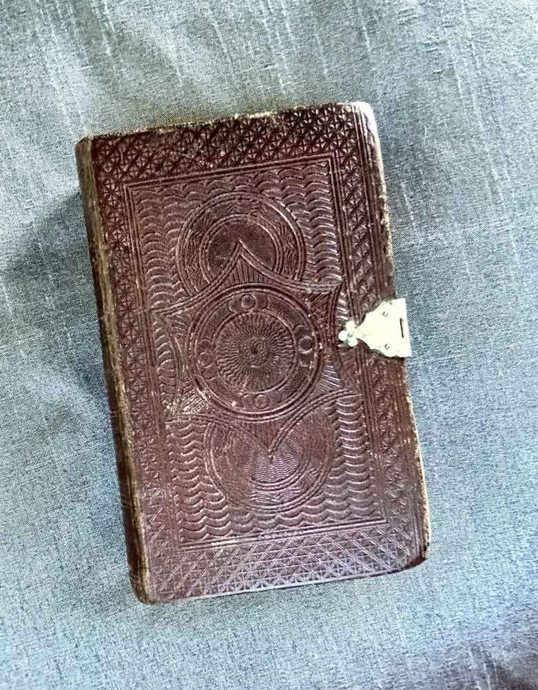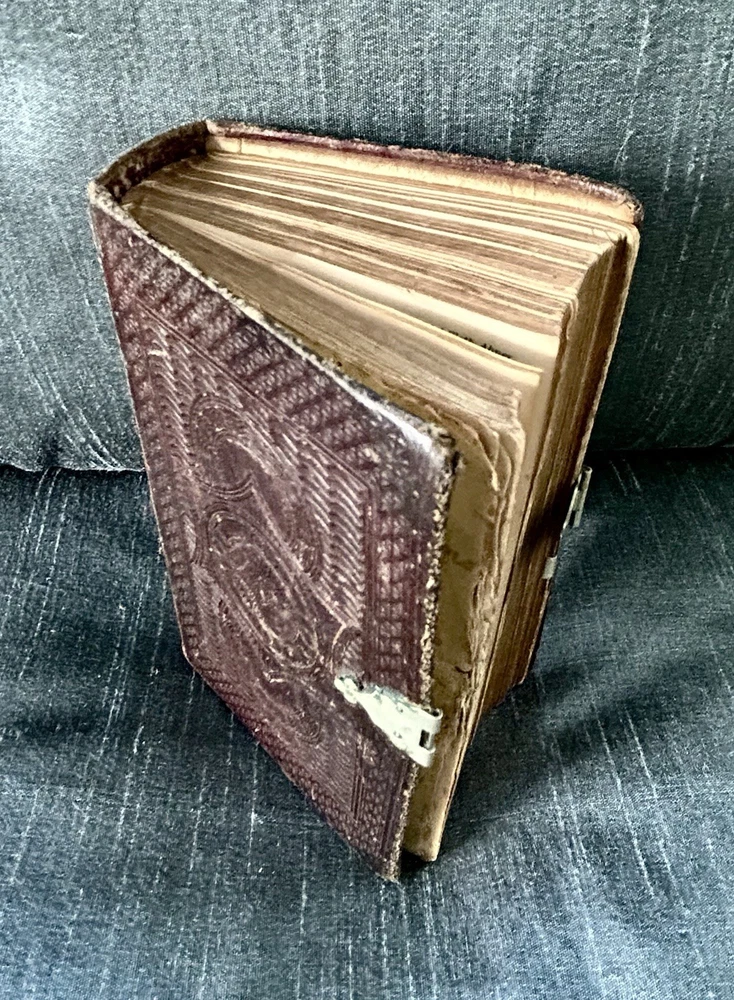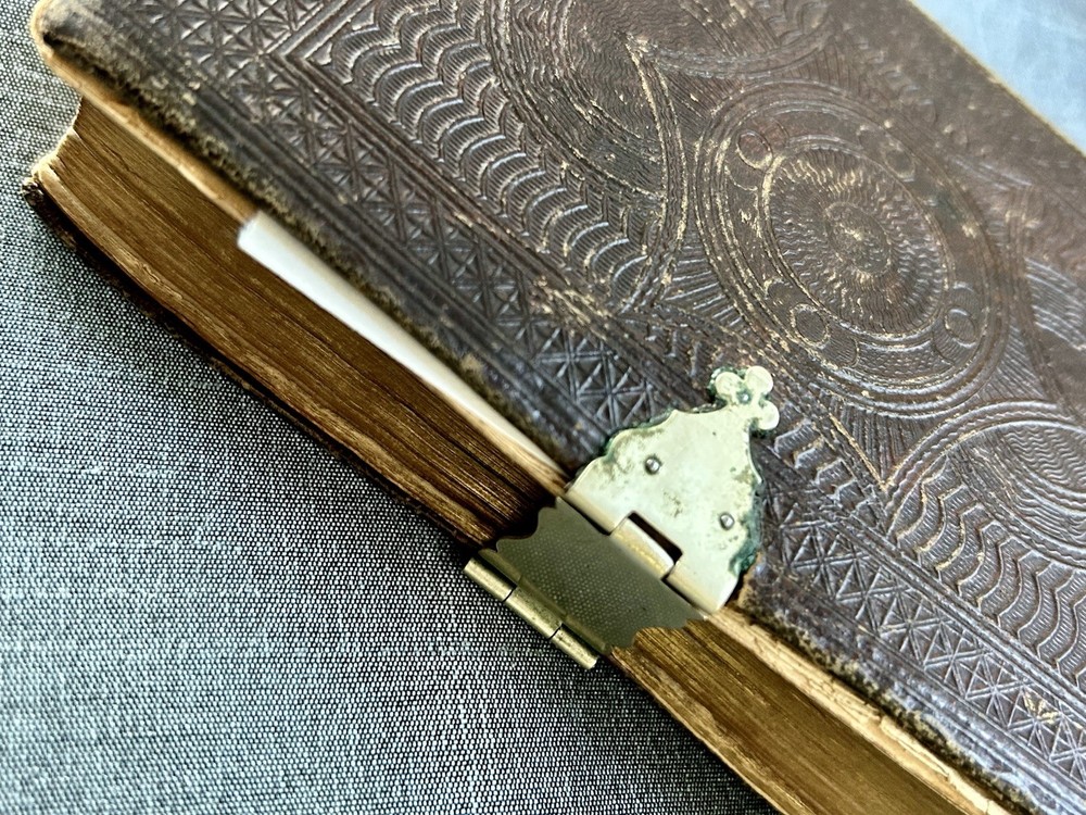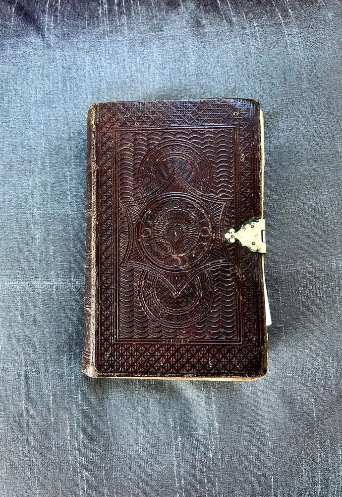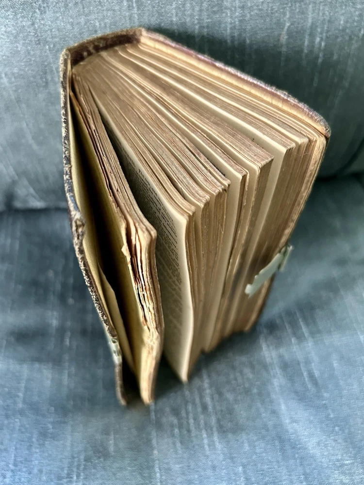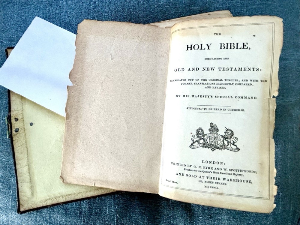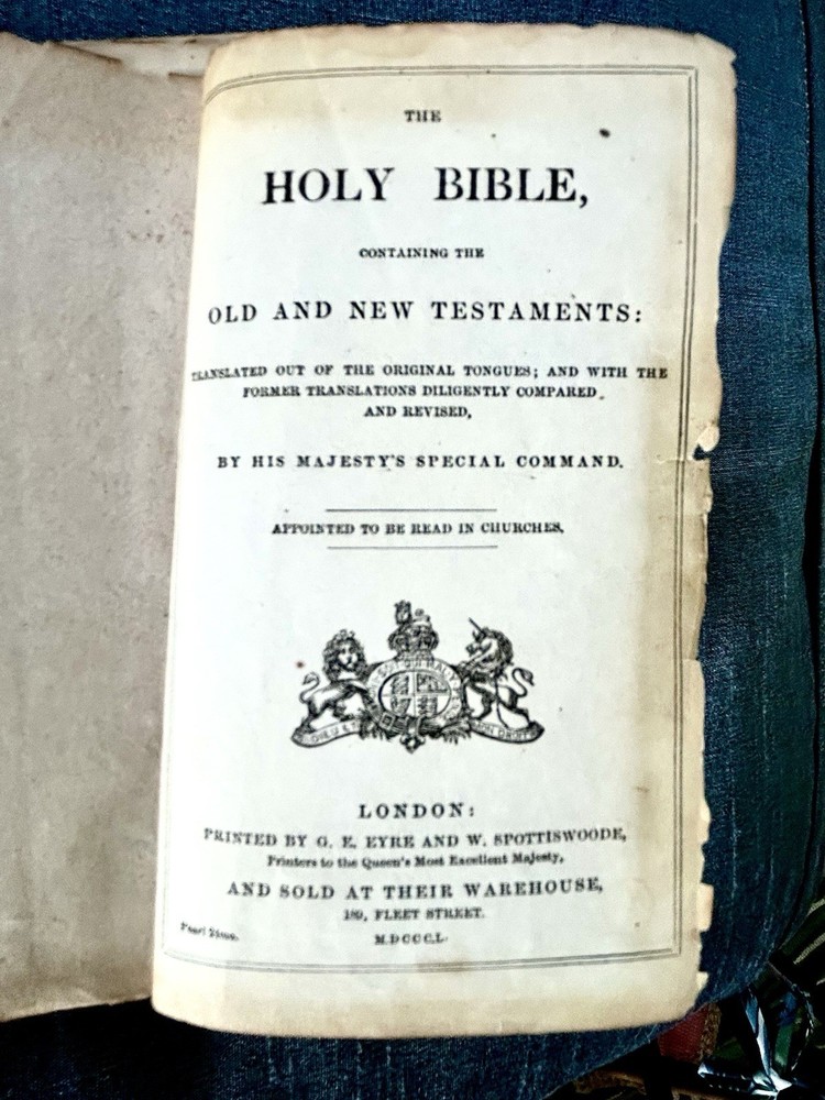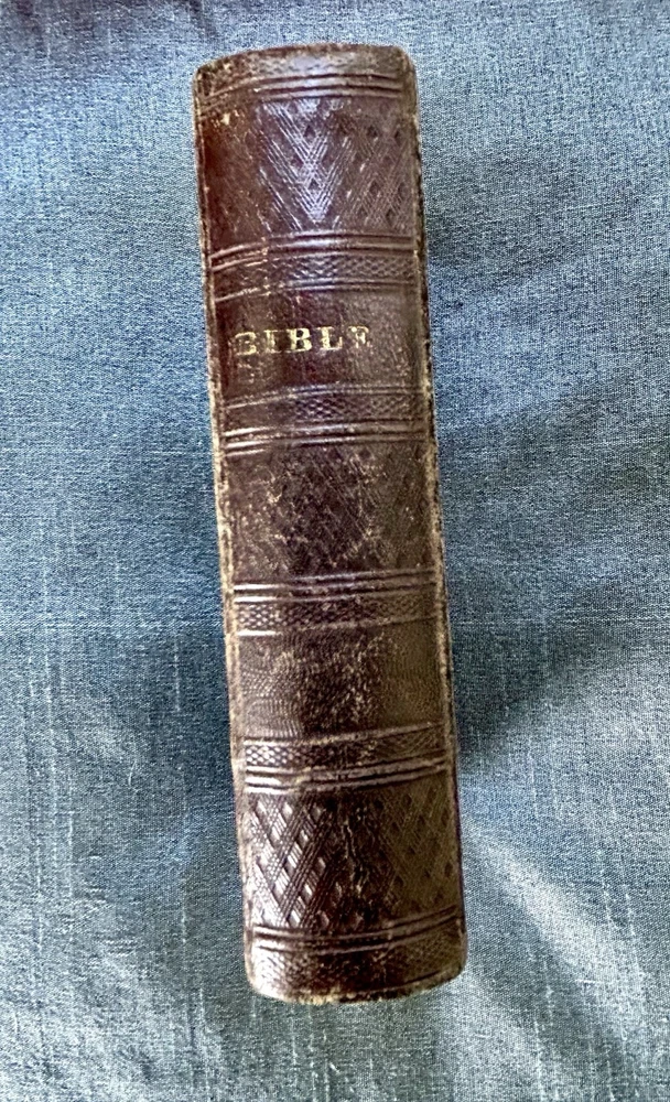 175 Year Old Rare Antiquarian Copy - The hand written note states that the bible was presented as a gift in 1851. The Roman Numeral published date dates this bible to 1850. This bible is about 3.5" x 5.5", the gilt edging has worn away, the hand tooled leather covers are beautifully crafted and the hinge closure works fine. The first two pages are loose, the binding is intact but the original glue to hold it into place has also worn away as shown. I have not found another example of this particular style, age and size. Rare. King James Version Bible, By His Majesty’s Special Command, London, Printed by George E. Eyre and William Spottiswoode For the British and Foreign Bible Society