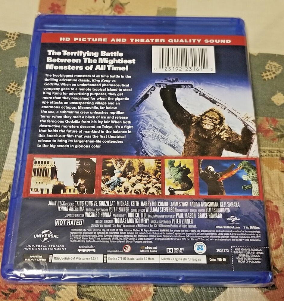 Producer: John Beck, Tomoyuki Tanaka gtin13: 0025192231612 Format: Blu-ray Rating: NR Movie/TV Title: King Kong Vs. Godzilla Release Year: 1962 Sub-Genre: Science Fiction Studio: Universal Studios UPC: 0025192231612 Genre: Action & Adventure Director: Ishiro Honda, Thomas Montgomery