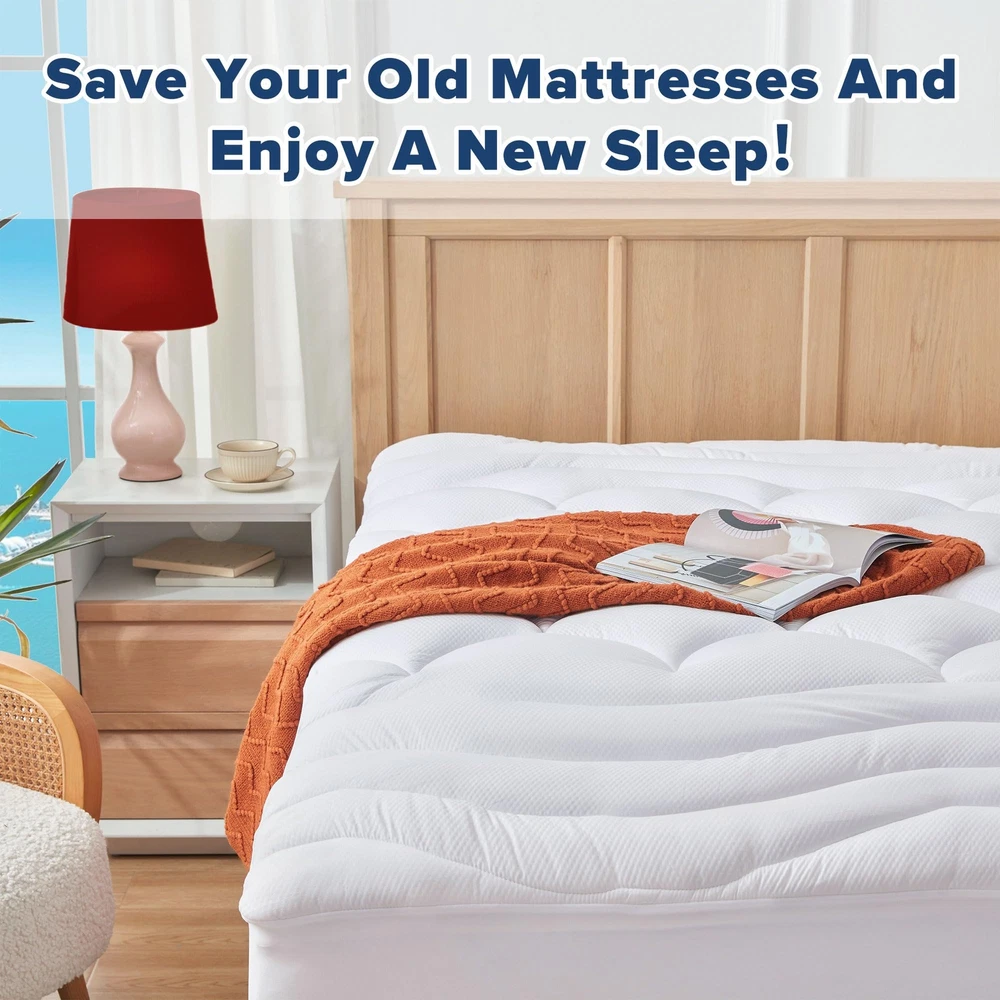 THICK MATTRESS PAD FOR BACK PAIN - The thickness is the first difference you can immediately feel between it and a common mattress pad. This mattress pad is overfilled with premium down alternative filling. Designed for people who need more cushioning, it provides great comfort and support to relieve back pain. Though thick like a foam topper, the breathable fiberfill won’t cause body overheat like memory foam during sleep. With it, your mattress will be as comfortable as those in luxury hotels SUPER SOFT & FLUFFY - This ia an extra thick padded mattress cover. It adds great softness & cushioning to your old mattress. The sleep surface is made of brushed microfiber, soft and no pilling. After embossing, it is more breathable, comfortable and exquisite. The filling is premium down alternative fiberfill which offers great breathability and resilience, making this mattress pad fluffy & cozy always. Machine washable. Highly recommended to order or more pieces for easy ZONED QUILTING & DEEP POCKET- Arc quilting at the center and Wavy quilting at the head & foot areas. The quilting is reminiscent of "Sun Rising On The Sea". It will create a cozy and warm vibe for your bedroom. And it makes the mattress pad more stylish. The wrap around knitted pocket stretches upto 21 inches which fits mattresses of different depths. 1.6-inch width elastic band can securely hold your wrap in place. Non-slip and noiseless, ensuring you get an uninterrupted sleep all night UPGRADE YOUR MATTRESS - Don't hesitate to try this extra thick mattress pad, you will be impressed by the comfort & support it brings to your bed. Also it is a decent holiday gift for your spouse, parents and friends (Well packaged in a sturdy box). ⚫️Notes: The pad comes vacuum-packed. It looks not so fluffy when you open it. Please machine wash & tumble dry it on low heat to make it fluffy again CHOICE WON’T REGRET - is professional in providing high-quality bedding products. We are committed to improving your sleep by thoughtful innovations. This king (78”x80”) mattress pad is for master bedrooms, couples who need more space. Besides this Extra Thick Mattress Pad, we also offer ⚫️Waterproof Mattress Pad - with an innovative waterproof lining which protects your pricy mattress against water or urine