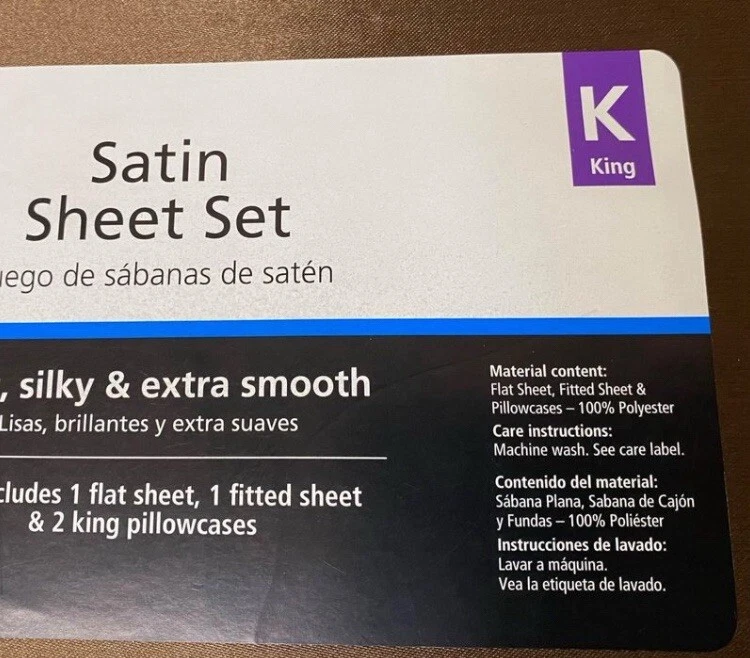 Mainstays King Satin Sheet Set Brown For sale is this Mainstays King Size set There are two sticker stains on the front cover as seen in photos but it is just a satin case that holds the sheets them self This set is BRAND NEW! Includes 1 king flat sheet 108 in x 102 in (274 cm x 259.1 cm) Fits mattresses 78 in x 80 in (198.1 cm x 203.2 cm) 1 king fitted sheet Fits mattresses 78 in x 80 in + 12 in (198.1 cm x 203.2 cm + 30.5 cm) Fits mattress up to 12 in deep (30.5 cm) 2 king pillowcases 20 in x 40 in (50.8 cm x 101.6 cm) Fit pillows 20 in x 36 in (50.8 cm x 91.4 cm) Brand new Any questions please ask