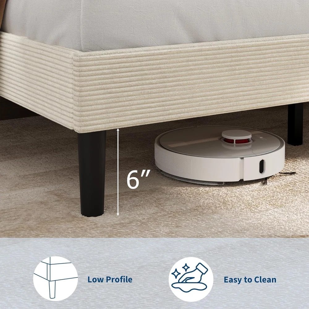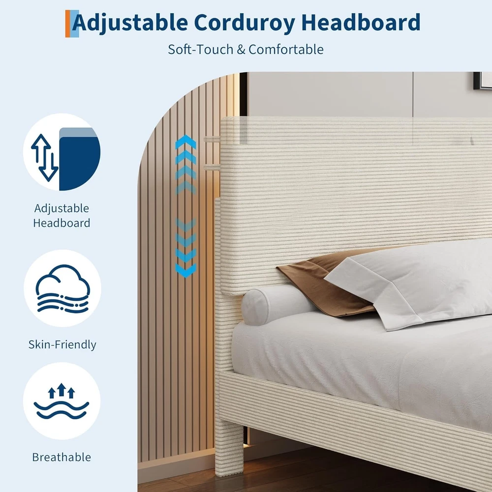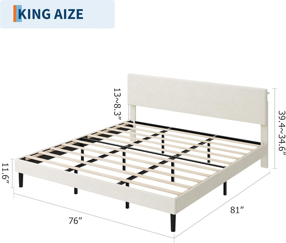 King Size Bed Frame, Storage Headboard with Charging Station, Solid and Stable, item description: 【Corduroy Upholstery Bed Fame】Upholstered in soft, high-quality corduroy fabric, this platform bed frame adds a touch of elegant style to any bedroom. The versatile beige color complements various decor themes, creating a cozy and contemporary atmosphere. Its plush surface ensures comfortable leaning and enhances the room's overall aesthetic appeal. 【Integrated USB Charging Station】This twin size bed frame features a built-in charging station with dual USB ports, allowing you to conveniently power your phones, tablets, and laptops right from your bedside. Say goodbye to cluttered cords and stay organized. 【Adjustable Headboard with Storage Shelf & Under-Bed Space】Maximize your bedroom storage with the versatile headboard design, which includes a handy shelf for keeping books, alarms, or decorative items within easy reach. The 6-inch clearance underneath the platform bed frame offers additional space for storing bins or boxes, making cleaning effortless and helping you maintain a tidy, clutter-free sleeping environment. 【Sturdy Wooden Slat Support – No Box Spring Needed】Engineered for durability and quiet performance, this upholstered platform bed frame is built with reinforced wooden slats that provide strong, reliable support for your mattress without the need for a box spring. Anti-slip strips and noise-free padding ensure solid construction and minimize movement, offering you a peaceful and restful night’s sleep for years to come.