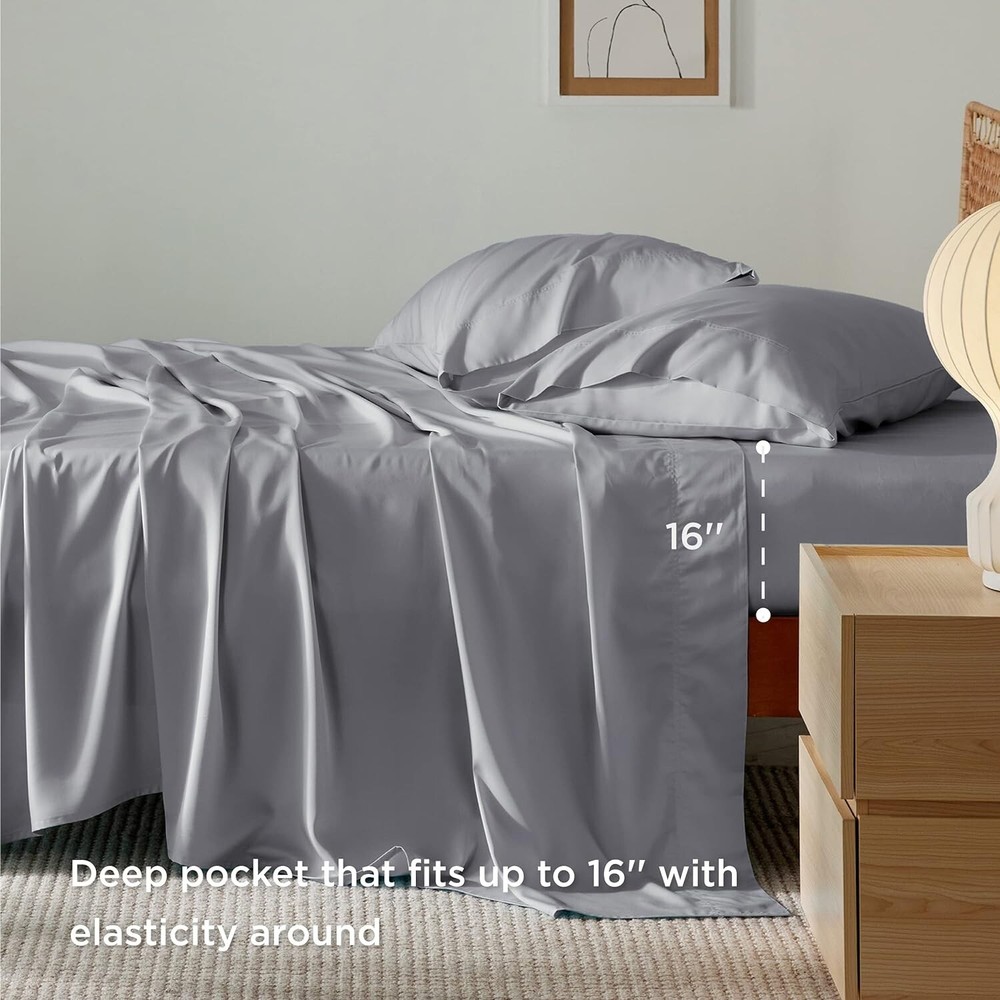 King Size Sheet Set, Cooling Sheets King, Rayon Derived from Bamboo, Deep Pocket Up to 16", Breathable & Soft Bed Sheets, Hotel Luxury Silky Bedding Sheets & Pillowcases, Silver Grey Silky Soft: King Sheet Set are made from rayon derived from bamboo with a unique twill weave, making it stronger than cotton and smooth like silk. Sleep like you're on a cloud with our comfy bed sheets. Cool & Dry All Night: Experience the ultimate comfort and luxury with these sheets set. Made from rayon derived from bamboo, these cooling sheets are moisture-wicking, breathable, and thermoregulating, keeping you refreshed all round. Deep Pocket & Easy Fit: A deep pocket fitted sheet is included in the set and fits mattresses up to 16 inches thick. The elastic band around the edge ensures a secure fit that won't shift while you sleep. The included silky-smooth envelope closure pillowcases reduce friction on your hair, keeping your locks smooth and healthy. Easy to Care: These chill sheets are OEKO-TEX Standard 100 certified for high safety standards. Simply machine wash them in cold water on a gentle cycle for a like-new restoration, do not use bleach and fabric softener. What You Get: This Bedsheets for King Size Bed includes two pillowcases (20" x 40"), a flat sheet (108" x 102"), and a fitted sheet (78" x 80").
