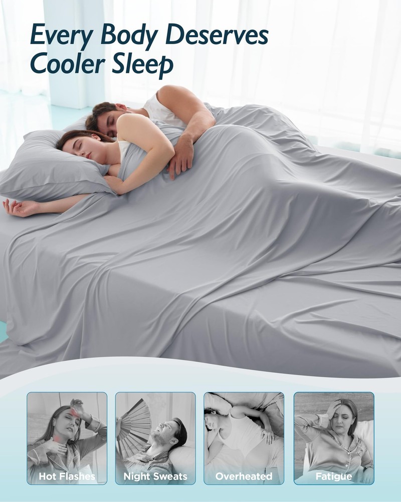 Cooling Sheet Sets for Hot Sleeper What You Get: This sheet set includes 1 flat sheet (106" x 108"), 1 fitted sheet (77" x 77"), 2 pillowcases (20" x 36"), the flat sheet offers up to 15.3% more coverage to standard flat sheet, draping nicely to gently hug your body for all-around comfort. Whole-Night Cooling: Start experiencing breezier nights with our cooling sheet set. Crafted with our innovative BlendTek fiber, it’s 3.1x cooler than bamboo rayon, 4.5x more breathable than cotton, and 1.5x more moisture-absorbent. Plus, with a Q-Max value of 0.46, it ensures you're sleeping on fabric that's instantly cool to the touch and stays that way all night. Temperature & Moisture Control: Our cooling bed sheets for hot sleepers are created with a unique polygonal fiber structure that's optimal for wicking away moisture, paired with breathable fiber gaps that enhance airflow. This combination helps heat and moisture escape quickly, keeping you comfortable throughout the night. Thoughtful Details: Every sheet set comes with deep pockets to fit mattresses up to 18 inches deep, ensuring a secure, snug fit on various bed sizes. Convenient side pockets keep essentials within reach, while the 360° elastic band offers a smooth, stay-in-place hold with anti-slip protection. Share the Comfort: Our BlendTek fibers, 6x finer than silk, are ultra-soft and gentle on sensitive skin, creating a lightweight, cloud-like feel. Plus, it's packaged in a gift-ready box with a handheld fan and laundry bag, making it the perfect way to share comfort with your loved ones. Enhanced Durability: With reinforced double-stitching, these cooling sheets are built to withstand daily use. To keep them feeling fresh, simply machine wash in cold water and tumble dry on low.