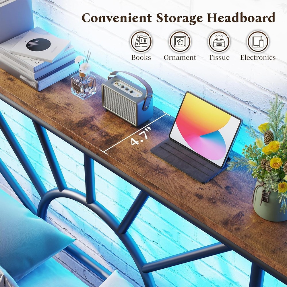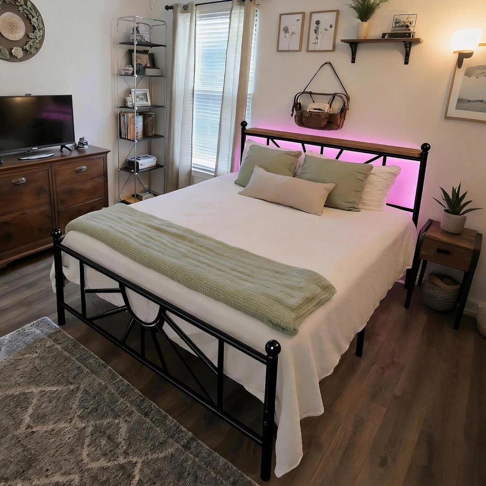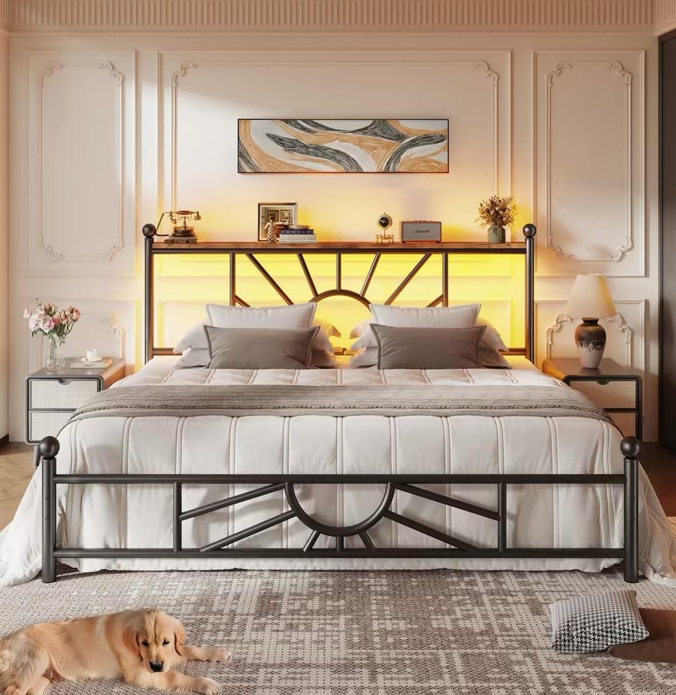 UNMATCHED 1,300 LBS WEIGHT CAPACITY - Engineered with reinforced heavy-duty metal frame and reinforced support slats, this metal bed frame offers 40% more weight capacity than standard frames (800-1,000 lbs), ensuring rock-solid stability for years. Great for families seeking peace of mind and long-lasting durability. DISTINCTIVE SUN RAY GEOMETRIC HEADBOARD - Stand out from ordinary railing bed frames with exclusive sunburst pattern design that combines modern industrial aesthetics with artistic elegance. Premium matte black finish adds sophisticated charm to your bedroom, transforming it into a stylish sanctuary. KING BED FRAME AND HEADBOARD - This king size bed frame features a headboard storage shelf, suited for keeping essentials like books, phones, and glasses within easy reach. When you lie on this mattress foundation, you can effortlessly access your belongings without needing additional storage furniture. ROMANTIC & FUNCTIONAL LED LIGHTING - Enhance your bedroom ambiance with the built-in LED lights on this classic king bed frame. Featuring 20 color modes and a 15-meter control range remote, this king size bed frame allows you to easily customize lighting for relaxation, romance, or entertainment. At night, the LED lights also provide soft illumination to help you navigate safely and avoid tripping in the dark. HIDDEN STORAGE UNDER THE BED - This black king bed frame and headboard is designed with generous under-bed clearance, providing ample space to store bedding, seasonal items, or other belongings. It keeps your clutter neatly tucked away, helping you maintain a tidy and organized room without sacrificing style. HASSLE-FREE ASSEMBLY - All hardware, tools, and step-by-step illustrated instructions included with clearly labeled parts. Even first-time furniture assemblers can complete setup quickly. Product description Metal Bed Frame with Headboard & LED Light The video showcases the product in use. The video guides you through product setup. The video compares multiple products. The video shows the product being unpacked. metal bed frame Merchant Video Functional Designs Storage Headboard LED Light Strip Easy to Assemble Similar Products for Your Service Add to Cart Add to Cart Add to Cart Add to Cart Add to Cart Customer Reviews 4.4 out of 5 stars 318 4.3 out of 5 stars 31 4.0 out of 5 stars 27 3.9 out of 5 stars 52 4.3 out of 5 stars 24 Price $149.99 $ 149 . 99 $159.99 $ 159 . 99 $159.99 $ 159 . 99 $79.99 $ 79 . 99 $99.99 $ 99 . 99 Size 82.5"L x 76.5"W x 41.3"H 87.4"L x 77.95"W x 41.73"H 81"L x 78.3"W x 43.5"H 82"L x 62"W x 38"H 80"L x 63"W x 45"H Storage Headboard ✔ ✔ ✔ ✘ ✔ Load Bearing 1300 880 880 882 882 LED Light ✔ ✔ ✔ ✔ ✔ Charging Station ✘ ✘ ✘ ✘ ✔ Is this product easy to install? This bed frame is easy to assemble, comes with an installation manual, and has a step-by-step installation video available on the homepage for your reference. What is the suitable mattress thickness for this bed frame? 9-14 inches Does this bed frame stay sturdy and quiet when I toss and turn? Yes! The bed is made with quality materials and soundproofing foam, ensuring quietness and stability.