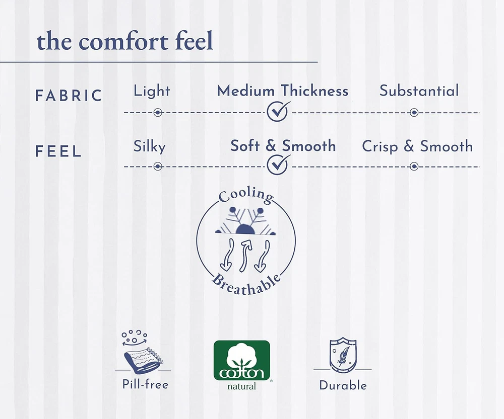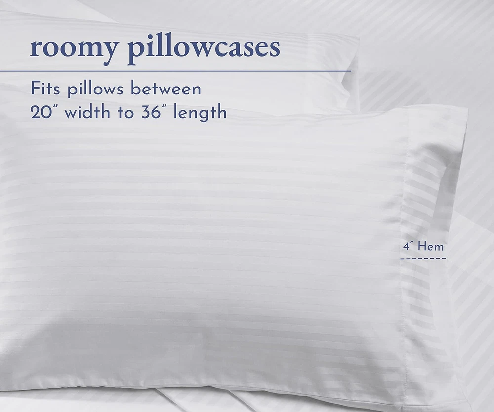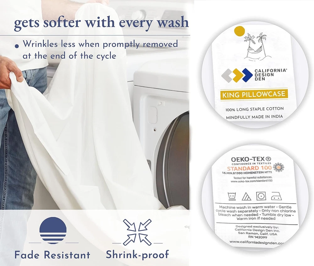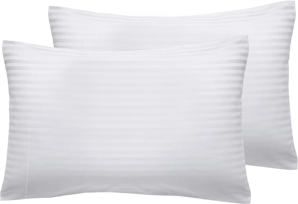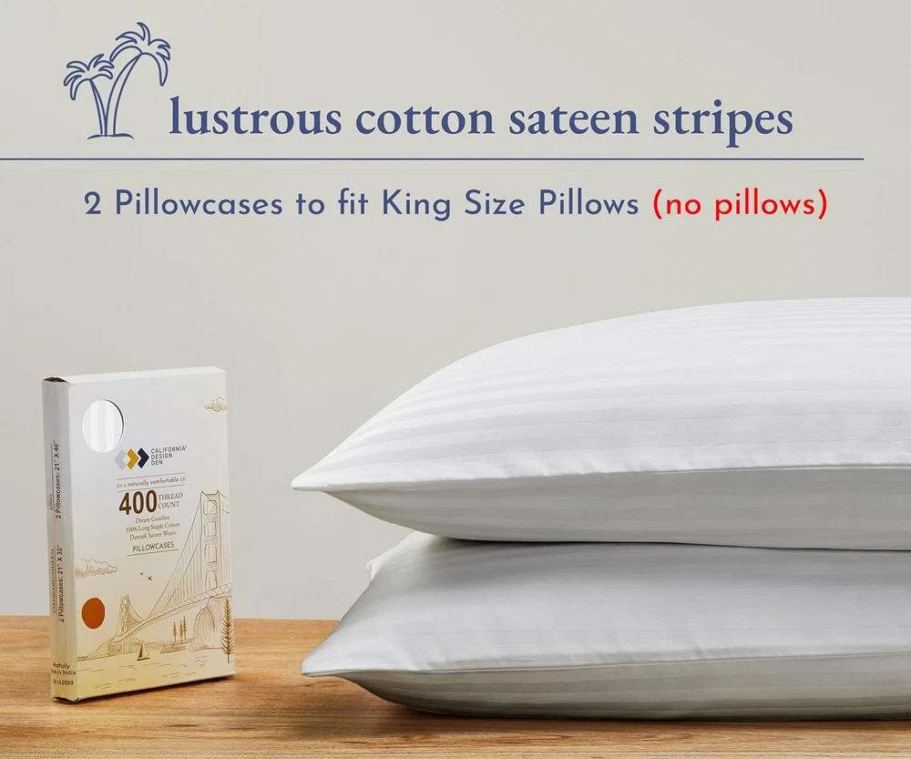 Menu Other Items Feedbacks About Us Contact Us Add To Favorites King Size Pillowcase Set - 400 Thread Count, 100% Cotton Sateen, Luxury Set of 2 Pillow Covers, Breathable, Cooling, Soft for Comfortable Quality Sleep - Striped Bright White Naturally Soft and Cool Pillowcases - Our 400 thread count 100% cotton striped bright white king pillowcase pair is perfect for a restful night's sleep. Made with cooling and breathable cotton, providing comfort for all seasons and for any bedding set. King Size Fit - Our cotton pillowcase set of 2 (21" W x 40" L) are designed for king size pillows. Featuring a 4-inch hem to prevent pillows from slipping out and providing a perfect fit for a quality night's sleep. Easy Care and Wash - The long-staple cotton quality of our pillowcase set ensures durability and longevity, with no pilling or fading for years. Machine wash & dry at regular setting. These pillowcases provide a unique blend of luxury and practicality. Friendly On Your Skin - Our cooling pillow cover is gentle on the skin and naturally breathable, ensuring a cool and comfortable sleeping experience all night long. Ideal for those with sensitive skin. Our Commitment - In 2022 & 2023, we donated over 22,000 pieces of bedding to local charities in the USA. We do not use plastic in our packaging, and our pillowcases are produced in our family-owned and operated factory in India. Each piece is inspected for quality, and we promise to replace any defective products at no cost to you. Buy with confidence with our 30-day return policy, even if you've washed or used our product. Product Description Add to Cart Add to Cart Add to Cart Customer Reviews 4.5 out of 5 stars 79,730 4.5 out of 5 stars 23,023 4.5 out of 5 stars 12,625 4.4 out of 5 stars 3,239 4.3 out of 5 stars 13 3.5 out of 5 stars 119 Price $42.99 $ 42 . 99 $32.99 $ 32 . 99 $54.99 $ 54 . 99 — — — Thread Count 400 400 500 500 NA NA Feel Soft & Smooth Soft & Smooth Silky Soft Silky Soft Soft & Calming Soft & silky Weight Optimum Optimum Light Light 8lb,12lb,15lb NA Features + Benefits Sateen Luxe Weave - A lustrous, closely woven ultra-soft, smooth and shiny satin like fabric King 2 Piece Set – 2 Pillowcases to fit standard pillows: 21" W x 40" L (53cm W x 102cm L) Key Details 100% Long Staple Cotton - Single Ply Yarns Authentic 400 Threads Per Square Inch Soft Sateen Weave Stylish Single Pleat Hem Smart Size indicators for easy use If you love silk pillowcases or satin pillowcases, this 100% cotton pillow cases, sateen-finish set of 2 delivers the same smooth comfort and style with greater breathability and comfort. Every set of 400-thread-count cotton pillowcase features a soft feel, durable construction, and classic style, perfect for any living space. King and Standard options are available. All of our sheets and pillowcases are created using pure cotton yarns. Cotton is combed by hand to filter out impurities and strengthen the fabric. Like our sheets, pillowcases by California Design Den are stitched by a skilled artisan, then checked by hand. This attention to detail makes them superior in look and feel to Egyptian cotton linens. For all color pillowcases to those in brighter hues, we offer a variety of color options for every living space. Our revolutionary new dyes help us to create lush-colored sheets and pillowcases through a process. Whether you are in search of a set of 2 or bulk pillowcases, we have the perfect option for you. This set pairs perfectly with our luxurious, 400-thread-count 100% cotton sheet sets. Whether you’re buying King Pillowcases for a new home, girls bedding or boys’ bedding like cool standard-size Pillowcases as a gift, all-natural cotton California Design Den Pillowcases offer quality and head-turning style at a value you can’t miss. Item Specification Closure Type Side Opening Style Pillowcases Number of Items 2 Color 02 - Striped White Pattern Striped Product Dimensions 40"L x 21"W Material Cotton Country of Origin India Number of Sets 1 Item Weight 14.7 ounces Size King Item Display Dimensions 6 x 9 x 1.25 inches Thread Count 400 Recommended Uses For Product Skin Protection, Indoor Special Feature 100% Cotton, Natural & Sustainable, Cooling, Lightweight, No-Shrink, No-Fade, No-Tear, Anti-Pilling Fabric Type Cotton Sateen Product Care Instructions Machine Wash, Tumble Dry Number of Pieces 2 Dimensions Shipping Returns Additional Info Product Dimensions: 21.0 "w x 40.0 "w. Weight: 14.7 oz Fast shipping is very important for us. Our standard shipping service is FREE. Your order will be shipped within 1-3 business days upon full payment received. Most items are delivered within 3-5 business days, however, please allow 3-10 business days. We are shipping only to USA. We only ship to the confirmed Paypal address. We reserve the right to cancel any order for any reason at any time. We are not responsible for undeliverable addresses. We offer a 30 day return policy from checkout winning date. Your satisfaction is guaranteed! If for any reason you are unhappy with your item, just return it within 30 days for a full refund, minus shipping cost. Please contact us prior to initiating a return so that we can issue you a refund authorization. Items defective upon receipt must be packaged in their retail packaging as if new and returned with a detailed description of the problem. Return shipping fees are not refundable. We reserve the right to decline any returns if the above guidelines are not followed. All of our items, unless otherwise stated, will only run on 120 volts. Please check to make sure your country complies with these specifications. If you have a problem or question regarding your transaction please contact us before leaving any type of feedback. We will work with you to resolve any problem you may have.