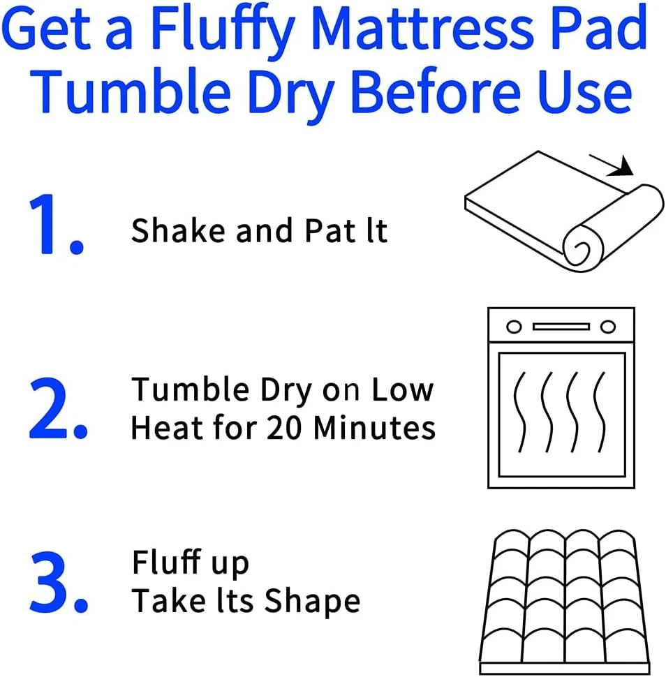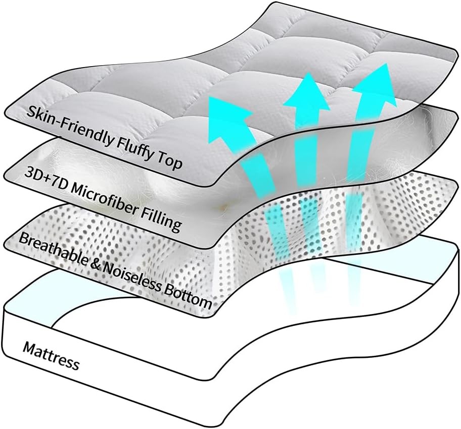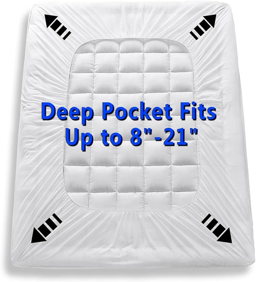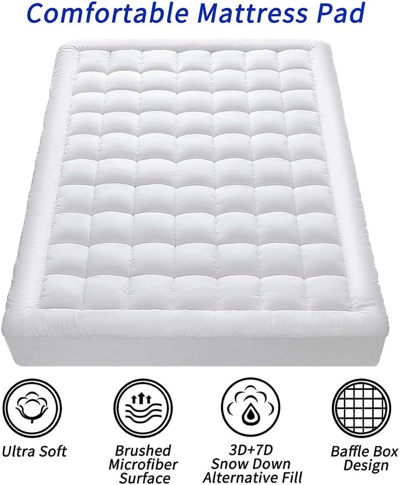 About this item QUILTED SURFACE - This quilted mattress pad locks filling evenly in place. It wards off clumping for consistent, long-lasting use. DOWN ALTERNATIVE FILLING - Its down alternative filling delivers soft, fluffy breathability. It protects your mattress and suits year-round use perfectly. DEEP POCKET - Featuring deep pockets with a fitted sheet style, this mattress pad fits 8-21 inch thick mattresses. It stays snug and secure, no slipping or shifting. MACHINE WASHABLE - This mattress pad is machine washable and dryer safe (no dry clean/bleach). Tumble dry on low heat or air dry before use to restore fluffiness. 365-Day GUARANTEE - We offer a 365-day satisfaction guarantee for this mattress pad. Contact our team anytime—we’ll do our best to assist. SIZE - Twin: 39" x 75" / Twin XL: 39" x 80" / Full: 54" x 75" / Queen: 60" x 80" / King: 78" x 80" / California King: 72" x 84". Brand: Color: White Size: King Fabric Type: Polyester Special Feature: Breathable, Cooling, Deep Pocket, Washable