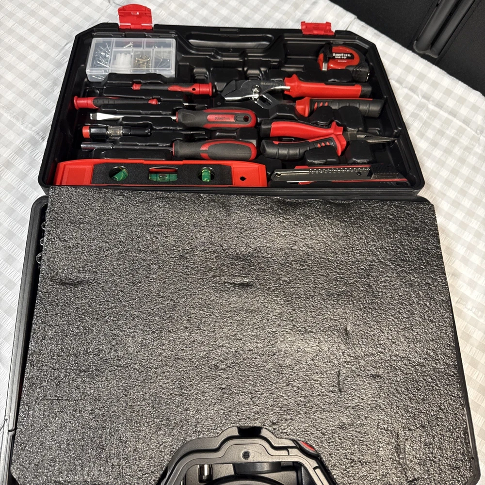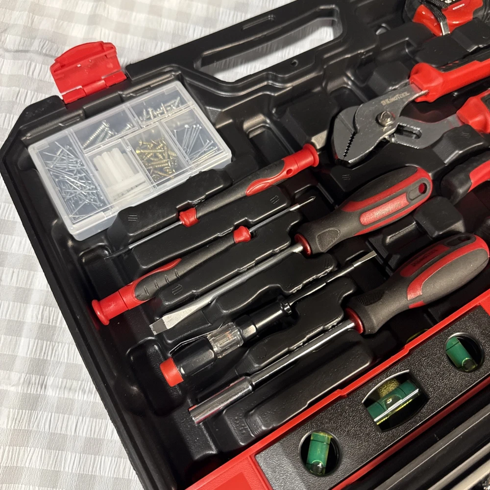 The KingTool 265 Piece Tool Set includes a wide variety of household and DIY tools, such as hammers, screwdrivers, wrenches, power drills, and pliers. The tools are organized in a hard case for easy storage and transport, and all pieces are included in the set. With a metric system of measurement and a mix of both metric and imperial units, this set is suitable for a range of projects around the home or in the workshop. The black and red case adds a stylish touch to this comprehensive tool collection.
