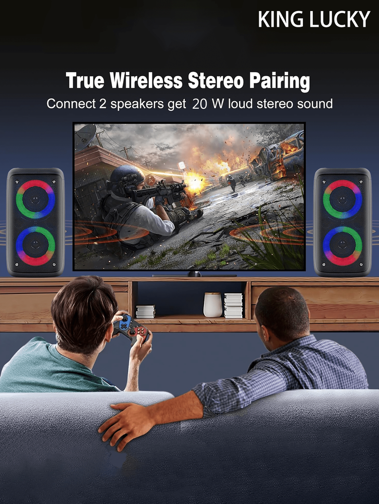 [TWS Function Stereo Surround]Quickly pair two kinglucky2301 wireless Bluetooth speakers ,instantly get an enhanced stereo surround experience. The sound of two wireless stereo speakers is synchronized to bring you powerful sound quality and an unprecedented listening experience. Perfect for indoor lectures, outdoor campfires, camping or parties. [Multifunctional Portable Bluetooth Speaker]kinglucky 2301 portable speaker has built-in the most advanced Bluetooth 5.0 technology, which can quickly connect to any device with Bluetooth, with a barrier-free transmission range of up to 32 feet. The mobile phone holder on the top can place your mobile phone to free your hands when watching movies or listening to music. [Special lights Effects ] Bluetooth speakers with special lights can give your party an exciting atmosphere, suitable for home, gym, yard, camping, swimming pool, beach.