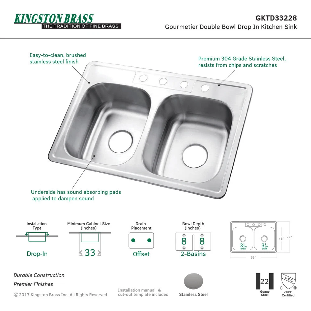 Powered by Frooition All Categories Kingston Brass GKTD33228 33" Drop In 21 Gauge Double Basin Stainless Steel Kitchen Sink Overview Item Description 21 Gauge Drop In Double Basin Stainless Steel Kitchen Sink Kingston Brass’ primary mission is to become the leading provider of cost effective, high quality products in the plumbing community. Their focus has made them grow by leaps and bounds in just a few years by identifying the key problems in manufacturing today and solving them. Kingston Brass produces high quality products ranging from kitchen, bath, and lavatory faucets to accessories such as diverters, towel bars, robe hooks, supply lines, and miscellaneous parts. With the low price, amazing stock times and quality products, you can rest assured that when you order a Kingston Brass product you will love every part of the experience, and it will last for generations to come. Features: Coordinates well with Traditional / Classic theme Faucet holes: 4 Faucet hole size: 1.5" Installation type: Drop In Number of basins: 2 Includes soap dispenser: No Drain connection: 3.5" Gauge: 21 Specifications: Length: 33" Width: 22" Why Choose BuildInc? OUR PROMISE TO YOU About Us At Build, we promise to provide the best selection we can, most competitive pricing, and unmatched customer service. Our store has quality home improvement products from trusted manufacturers like Moen, American Standard, Delta, Kraus, Kichler, Progress Lighting, Schlage, Kwikset, Baldwin, Broan, NuTone, Air King, and Rev-A-Shelf. With over 200,000 home improvement products for you to choose from, we have just what you need to get your project done. Fast & Free Shipping We promise to make it our priority to get you your items as fast as we can. We ship from 440 warehouses around the country, ensuring that your product will get to you as soon as possible. We know you're eager to get your hands on your new purchase, we would be too. As a bonus, most items ship for free. Returns We are happy to accept returns of unused or defective items for a refund within 30 days from the date of delivery. For returns outside 30 days, please contact our Customer Service team to go over our options. For full details, please view the Shipping and Payments tab above. To initiate a return simply go to the eBay Returns Portal and submit a return request. We ask that all items be returned with all original components via a traceable method. Once your return is received and processed, we will quickly get your refund or replacement issued. If for any reason you are unsatisfied with your purchase or for product or warranty questions, please contact Customer Service team for assistance. More Items! View more great items! About Us | Shipping | Returns | Contact Us | FAQ | Collections | Special Offers! Powered by Frooition Frooition Frooition | No-js Template | eBay design, eBay store design, eBay shop design, eBay template design, eBay listing design (ver:froo_no_js) This listing is currently undergoing maintenance, we apologize for any inconvenience caused.