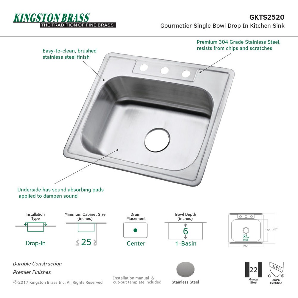 Powered by Frooition All Categories Kingston Brass GKTS2520 25" Drop In 22 Gauge Single Basin Stainless Steel Kitchen Sink Overview Item Description 22 Gauge Drop In Single Basin Stainless Steel Kitchen Sink Kingston Brass’ primary mission is to become the leading provider of cost effective, high quality products in the plumbing community. Their focus has made them grow by leaps and bounds in just a few years by identifying the key problems in manufacturing today and solving them. Kingston Brass produces high quality products ranging from kitchen, bath, and lavatory faucets to accessories such as diverters, towel bars, robe hooks, supply lines, and miscellaneous parts. With the low price, amazing stock times and quality products, you can rest assured that when you order a Kingston Brass product you will love every part of the experience, and it will last for generations to come. Features: Coordinates well with Traditional / Classic theme Faucet holes: 3 Faucet hole size: 1.5" Installation type: Drop In Number of basins: 1 Includes soap dispenser: No Drain connection: 3.5" Gauge: 22 Specifications: Length: 25" Width: 22" Why Choose BuildInc? OUR PROMISE TO YOU About Us At Build, we promise to provide the best selection we can, most competitive pricing, and unmatched customer service. Our store has quality home improvement products from trusted manufacturers like Moen, American Standard, Delta, Kraus, Kichler, Progress Lighting, Schlage, Kwikset, Baldwin, Broan, NuTone, Air King, and Rev-A-Shelf. With over 200,000 home improvement products for you to choose from, we have just what you need to get your project done. Fast & Free Shipping We promise to make it our priority to get you your items as fast as we can. We ship from 440 warehouses around the country, ensuring that your product will get to you as soon as possible. We know you're eager to get your hands on your new purchase, we would be too. As a bonus, most items ship for free. Returns We are happy to accept returns of unused or defective items for a refund within 30 days from the date of delivery. For returns outside 30 days, please contact our Customer Service team to go over our options. For full details, please view the Shipping and Payments tab above. To initiate a return simply go to the eBay Returns Portal and submit a return request. We ask that all items be returned with all original components via a traceable method. Once your return is received and processed, we will quickly get your refund or replacement issued. If for any reason you are unsatisfied with your purchase or for product or warranty questions, please contact Customer Service team for assistance. More Items! View more great items! About Us | Shipping | Returns | Contact Us | FAQ | Collections | Special Offers! Powered by Frooition Frooition Frooition | No-js Template | eBay design, eBay store design, eBay shop design, eBay template design, eBay listing design (ver:froo_no_js) This listing is currently undergoing maintenance, we apologize for any inconvenience caused.