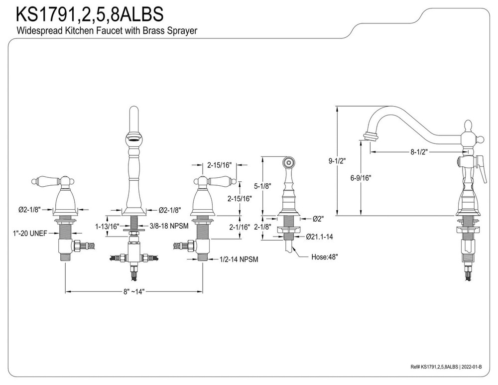 Solid brass construction Drip-free ceramic disc cartridge Deck mount 8" to 16" widespread 4-hole installation 1.8 GPM/6.8 LPM water flow rate at 60 PSI Standard 1/2" IPS connection