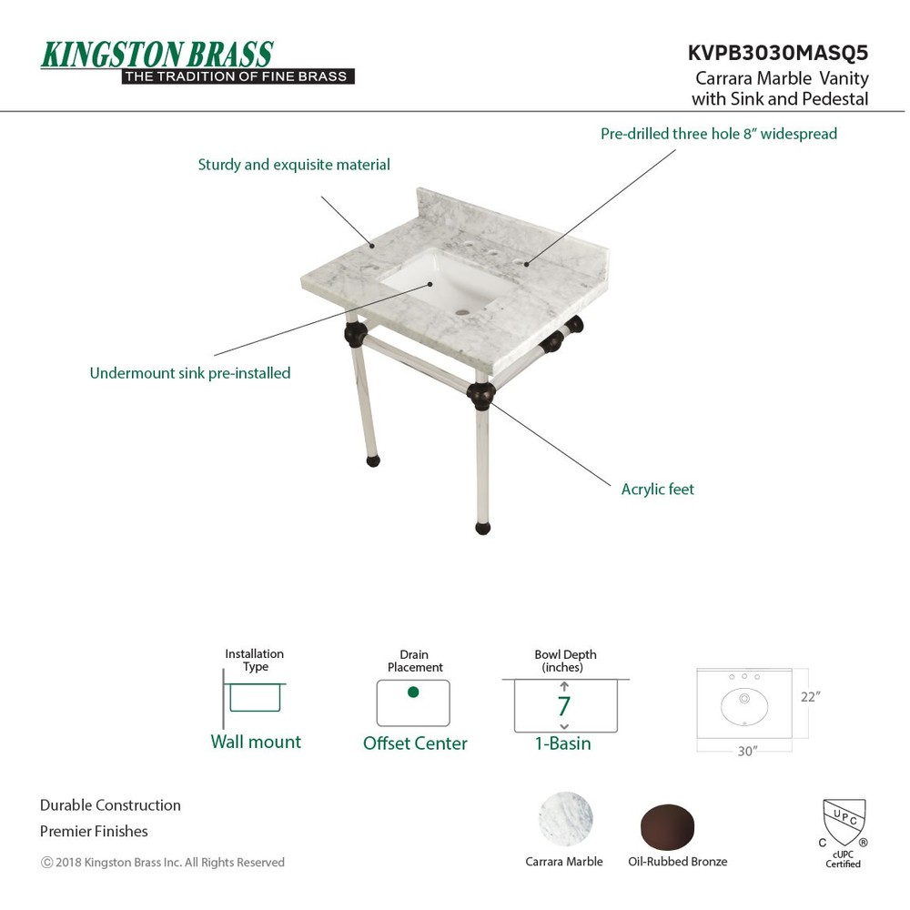 Collection: Templeton Type: Sinks Item Height: 34.75 Mounting: Wall Mounted, Console, Undermount Features: Kingston Brass KVPB3030MASQ Templeton 30" Brand: Kingston Brass California Prop 65 Warning: Yes Material: Acrylic Country/Region of Manufacture: China Item Length: in Model: KVPB3030MASQ Number of Faucet Holes: 3 Item Width: 30 in