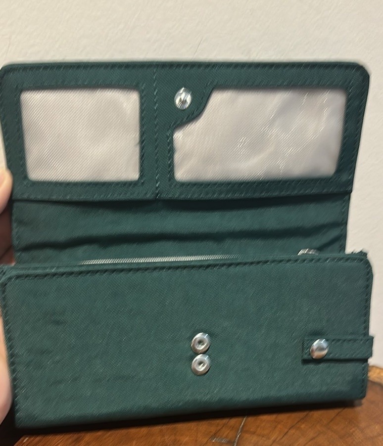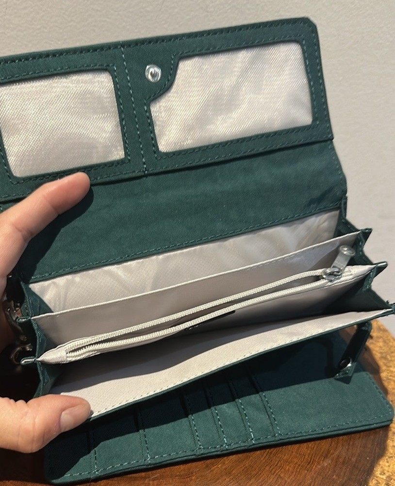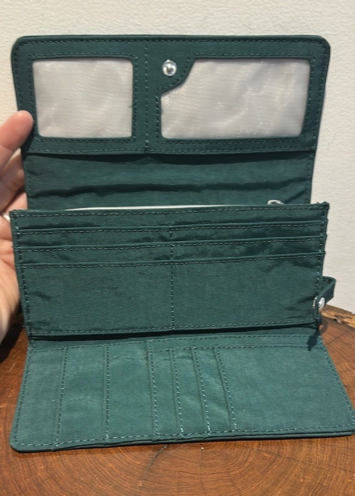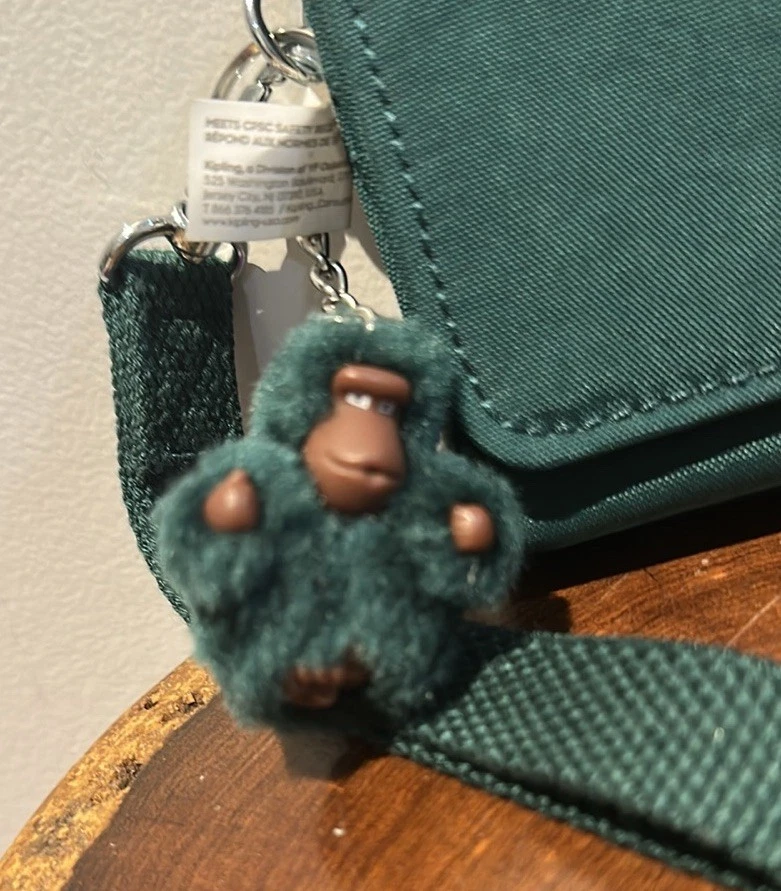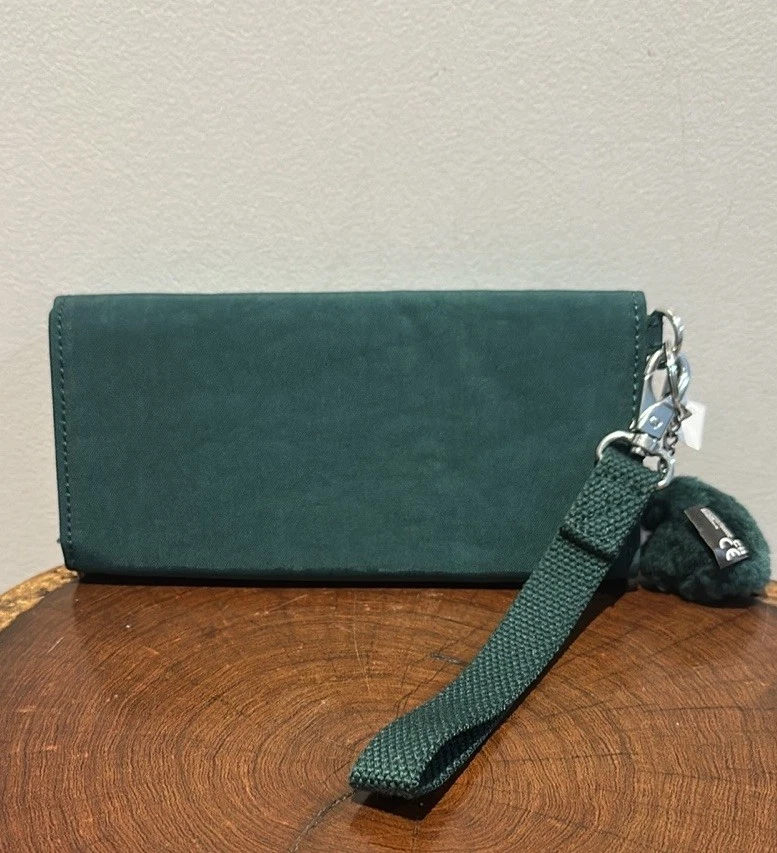 The Kipling Green Wristlet Wallet Organizer with Gorilla Keychain and Detachable Strap is a stylish and functional accessory for everyone. Made from lightweight polyamide material, this wallet features a solid deep green color with a unique Kipling Gorilla character charm. It includes a removable wristlet strap for easy carrying and has compartments for credit cards and an organizer for added convenience. The wallet also has a detachable strap, making it perfect for hiking and outdoor activities, with its earthy and recycled theme. The Kipling brand ensures quality and durability in this practical and fashionable item.