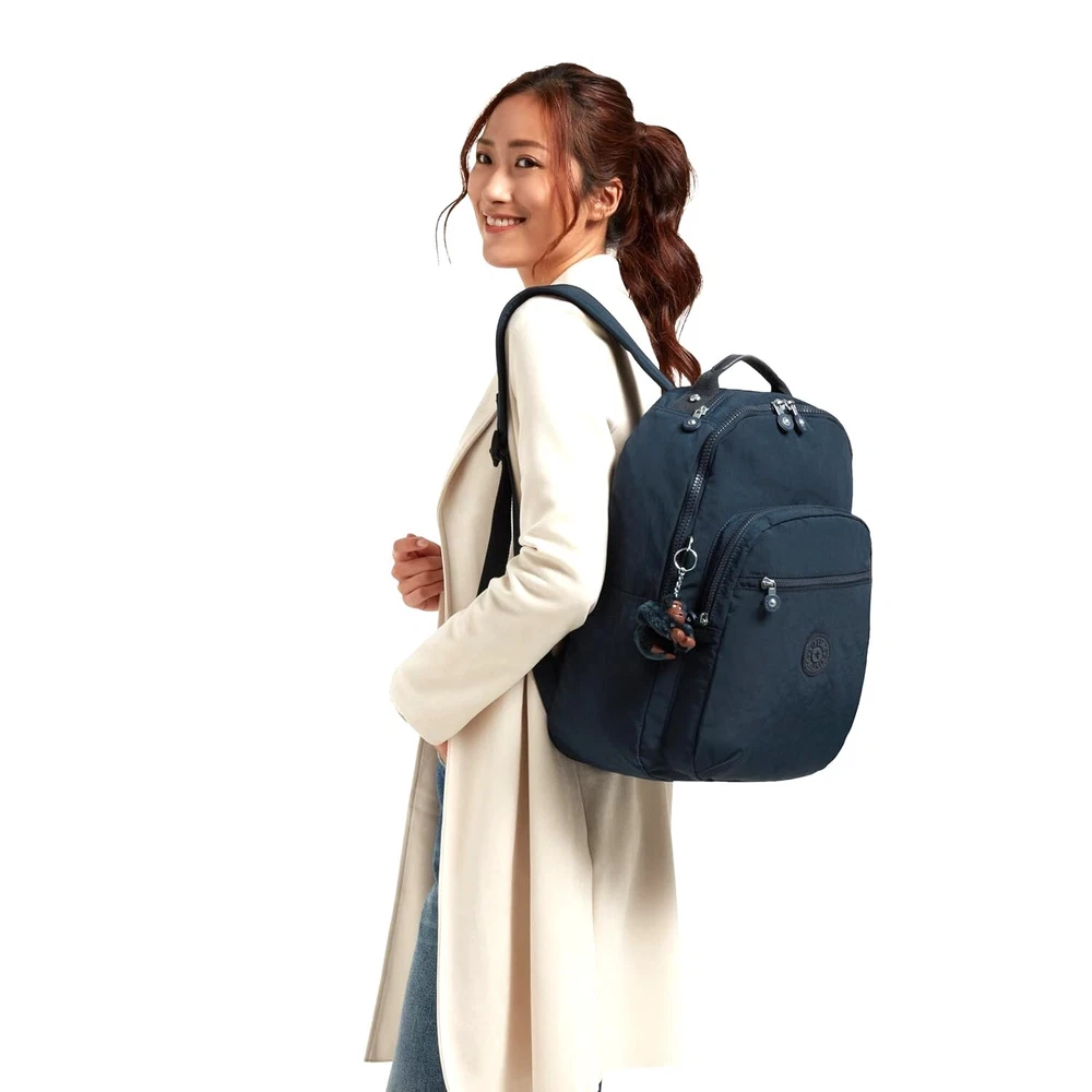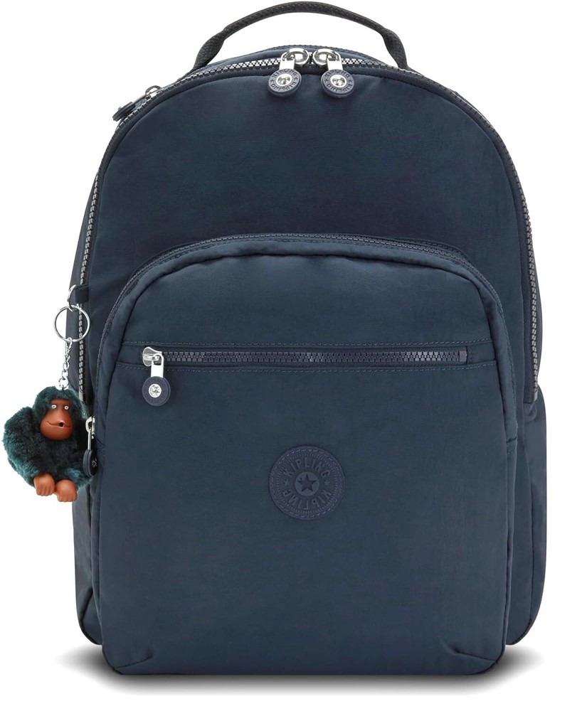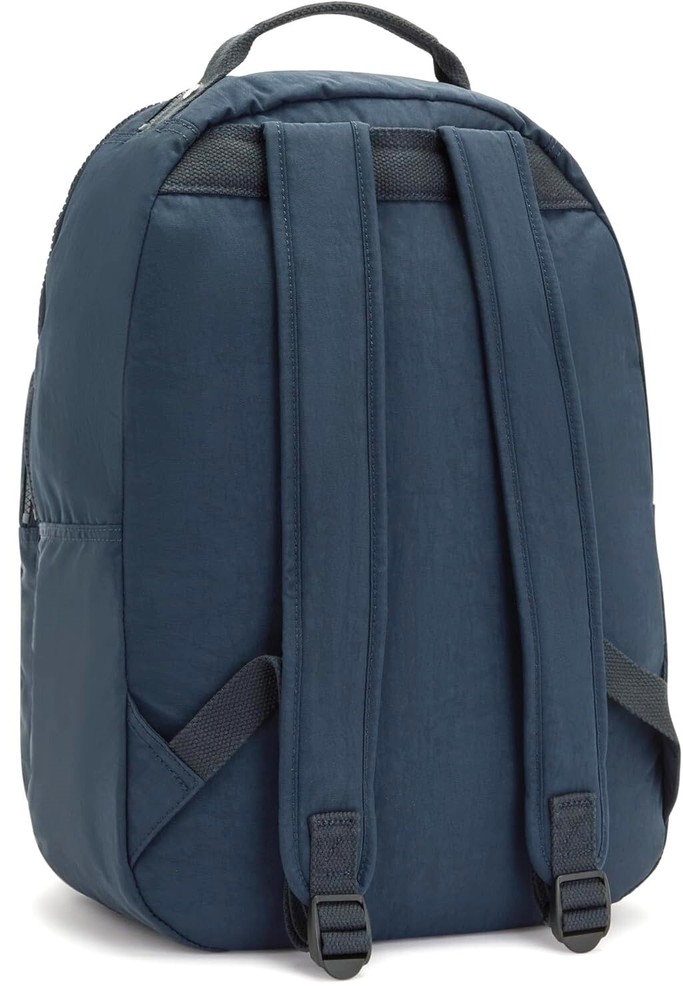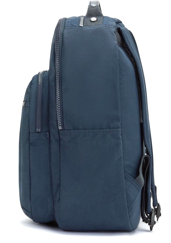 Kipling Seoul Large 15" Laptop Backpack True Blue Tonal - Style #KI9411-4DK The Seoul backpack from Kipling is constructed from a durable crinkle nylon with adjustable shoulder straps. Kipling's best-selling backpack highlights all of the iconic features and benefits Kipling is known for. The Seoul backpack is equipped with padded shoulder straps, a durable exterior and roomy interior. Easily fits all of life’s essentials (big & small), plus it has a built-in protective sleeve for your laptop, too! Retail price: $124.00 Bag features: Constructed from Kipling's signature water-resistant crinkle nylon Adjustable padded shoulder straps for carrying comfort Front exterior zip pocket; and front zippered compartment with two interior slip pockets (one sized for cell phone) and a pen holder Main rear zippered compartment features a large front wall slip pocket and a padded rear-wall laptop pocket (fits up to a 15" laptop) Top carry handle and top-zip pocket for sunglasses, etc. Dimensions : 17.25" high x 12.75" wide x 9.0" deep