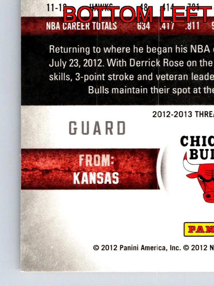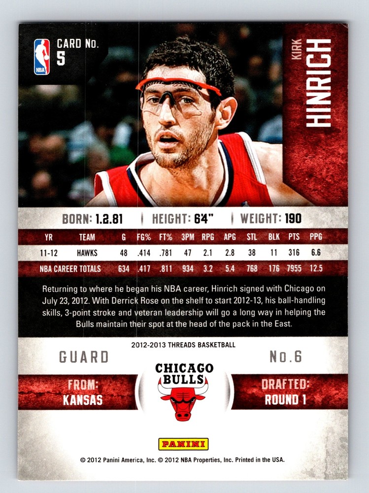 Item Description Title: Kirk Hinrich Guard Chicago Bulls Panini 20122013 Card 5 Basketball Memorabilia Description: This sports trading card features Kirk Hinrich, a skilled and dedicated guard who played a significant role with the Chicago Bulls. Part of the 2012-2013 Panini Threads Basketball set, this card captures Hinrich during a dynamic moment on the court, showcasing his intensity and expertise in ball-handling. Known for his three-point shooting and veteran leadership, Hinrich played a pivotal role in maintaining the Bulls' competitive edge in the Eastern Conference. The card highlights his statistics from his time with the Hawks, as well as his early career in the NBA. Standing at 6'4 and weighing 190 lbs, Hinrich's athletic prowess and strategic play decisions are celebrated through this collectible. Perfect for basketball fans and card collectors, this piece commemorates Hinrich's valuable contributions to the game. MRSP: $5.99 Sport: Basketball Player/Athlete: Kirk Hinrich Season: 2012-2013 Manufacturer: Panini Parallel/Variety: Unknown Set: Panini Threads Basketball 2012-2013 Team: Chicago Bulls League: National Basketball Association (NBA) Card Number: 5 Counter: 416 Folder: BASKETBALL1224002
