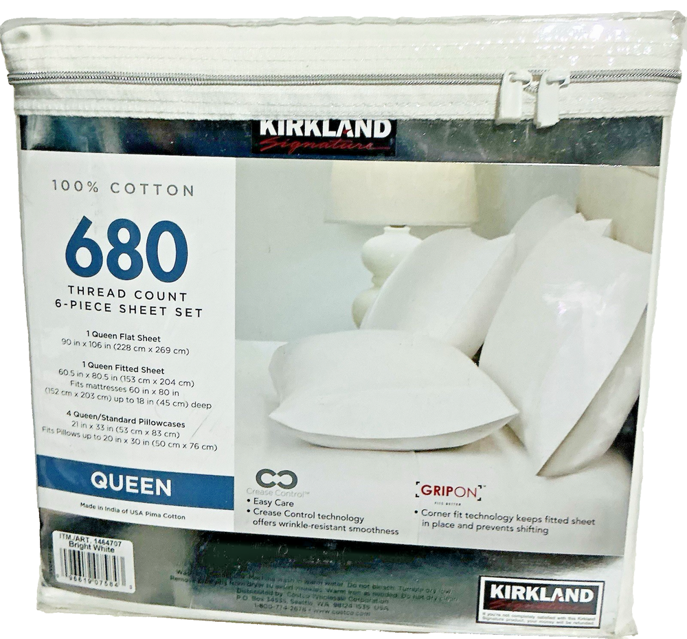 Kirkland Signature 680 Thread Count Sheet Set- Queen -Bright White-NEW WITHOUT TAG - CUSTOMER RETURN FROM WHOLESALE CLUB - EXCELLENT CONDITION FREE SHIPPING The Kirkland Signature 680 Thread Count Sheet Set in Queen size and Bright White color is a luxurious addition to any bedroom. Made by the trusted brand Kirkland, these solid color sheets offer a high-quality feel with a thread count of 680, providing a soft and comfortable sleeping experience. Perfect for creating a clean and stylish look in your bedroom, this sheet set is a must-have for those seeking both comfort and elegance in their bedding.