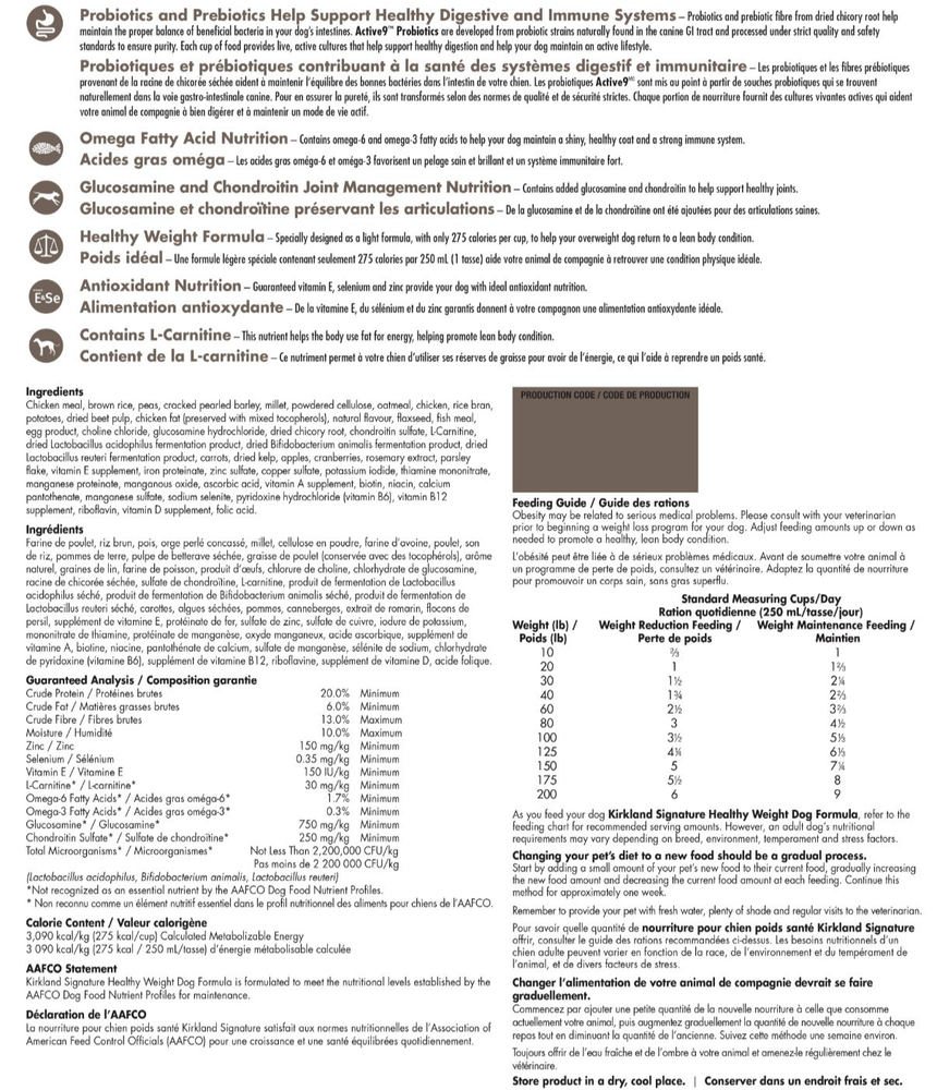 Kirkland Signature Healthy Weight Chicken Dog Food, 18.14 kg (40 lb.) – Adult Formula *Keep your dog healthy and lean with Kirkland Signature Healthy Weight Dog Food. Perfect for adult dogs prone to weight gain, this formula features optimal fat and fiber levels to support a healthy body condition. Made with fresh chicken, wholesome grains, vegetables, and fruit, it provides complete nutrition for overall well-being. Key Features: Supports healthy digestion & immune system with probiotics & prebiotics Omega-3 & omega-6 fatty acids for a shiny coat & strong immunity Added glucosamine & chondroitin for joint health Only 275 calories per cup to help maintain a lean body condition L-Carnitine helps use fat for energy, promoting a lean physique Vitamins E, selenium & zinc provide antioxidant support Eco-friendly packaging with 30% recycled content Specifications: Brand: Kirkland Signature Flavor: Chicken Size: 18.14 kg (40 lb) Type: Dry Dog Food Life Stage: Adult Quantity: 1 Bag Container: Bag Country of Origin: USA