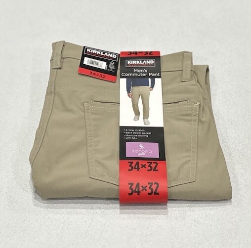 Kirkland Signature Men’s Commuter Pants Color: Tan Size: 34X32 Content: 52% Recycled Polyester / 48% Sorona Elasto Multiester