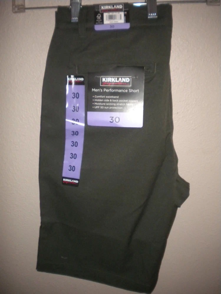 New with tags. Kirkland Signature Men's Size 30 Dark Green Comfort Waistband Performance Shorts NWT. Comfort Waistband. HIdden side and back pocket zippers. Moisture Wicking. Stretch Fabric. UPF 50 Sun Protection. Zipper with a snap. 100% Polyester. Front rise about 11 1/2". Inseam about 9 1/2". Weighs about 11oz. Buy with Confidence I have over 25,000+ Positive Feedbacks. Measurements are approximate and can vary depending on where they start and end. I cannot guarantee fit but I try and give as much information as possible to help you make a great Purchase. Shipping is based upon weight (which I provide in all listings) and the Shipping Option you choose, 4 options are available. The shipping offered is my Discounted Rate passed onto you the Buyer. Shipping daily. Please understand that I do my best to describe color. I can't guarantee that my Color will be your exact Color since Monitors and Opinions Vary. Offers are considered on certain items, use the "Best Offer" button. Sorry, I DO NOT ACCEPT RETURNS, feel free to ask questions. Each month I select a Charity to Donate to for many of my listings. I try to use recycled Shipping Materials whenever possible. Your Business is appreciated and if you like what you see, browse my Store to find more items you will love. Add me to your Favorites as New items are added Daily. Thank you! 4l