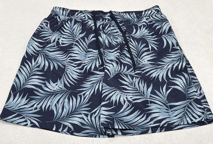 Kirkland Signature Men's Stretch Swim Shorts Size: Small Color: Blue Leaves Content: Shell: 89% Nylon / 11% Elastane Liner: 90% Polyester / 10% Elastane