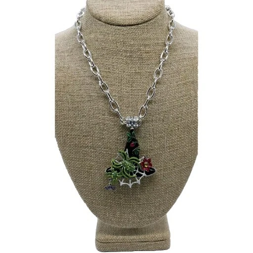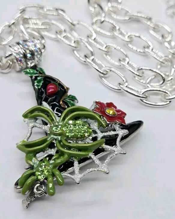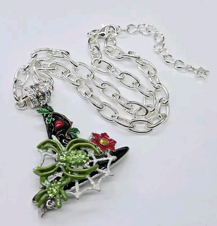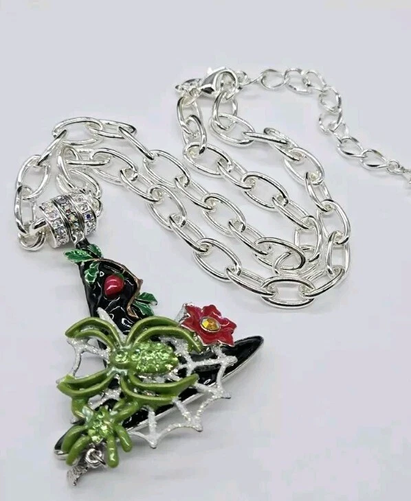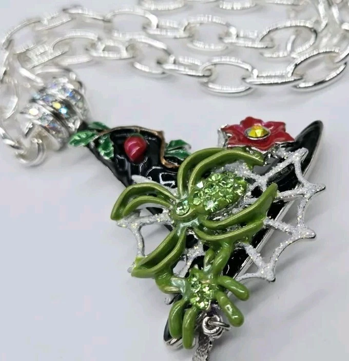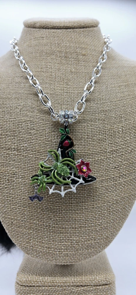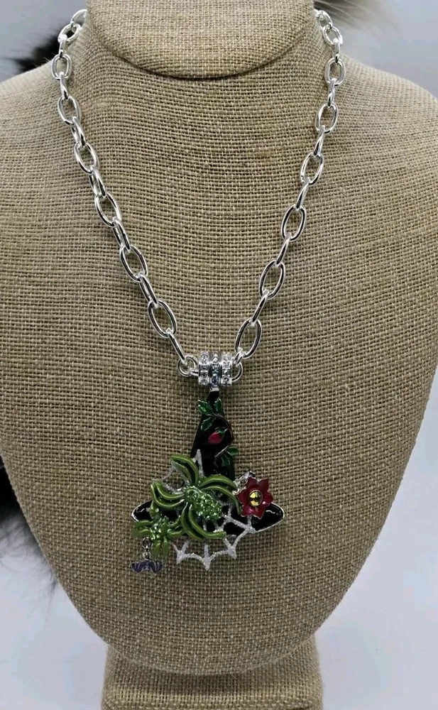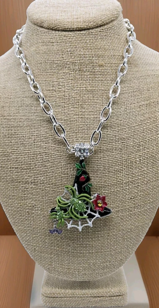 Magnetic Enhancer Pendant: Delight in the mystery and mischief of Halloween with the spellbinding "Spider Queen Witch Hat Magnetic Enhancer". The enchanting spider queen's witch hat has been hand-enameled jet black in honor of the haunted season. A shimmering silver Folly dusted web sparkles from the center of the eerie hat. Two green spiders embellished with glowing peridot crystals weave their magic. A ripe red berry with lush greens grows toward the tip of the bewitching hat as a red fantasy flower with a twinkling red crystal center is in bloom. A baby bat takes flight as he playfully dangles from the brim. Silver tone Measures approximately 2" x 3" Necklace: Step into the spotlight wearing the Fame Magnetic Enhancer Necklace! Beautiful high polished oval links come together to form a chain that can't be broken. It can be worn with or without a Kirk's Folly Magnetic Enhancer. Plated Silver tone. Measures approximately 18" long with a 2" extender chain. Kirks Folly Magnetic Enhancers Can Only Be Worn With Kirks Folly Magnetic Necklaces.