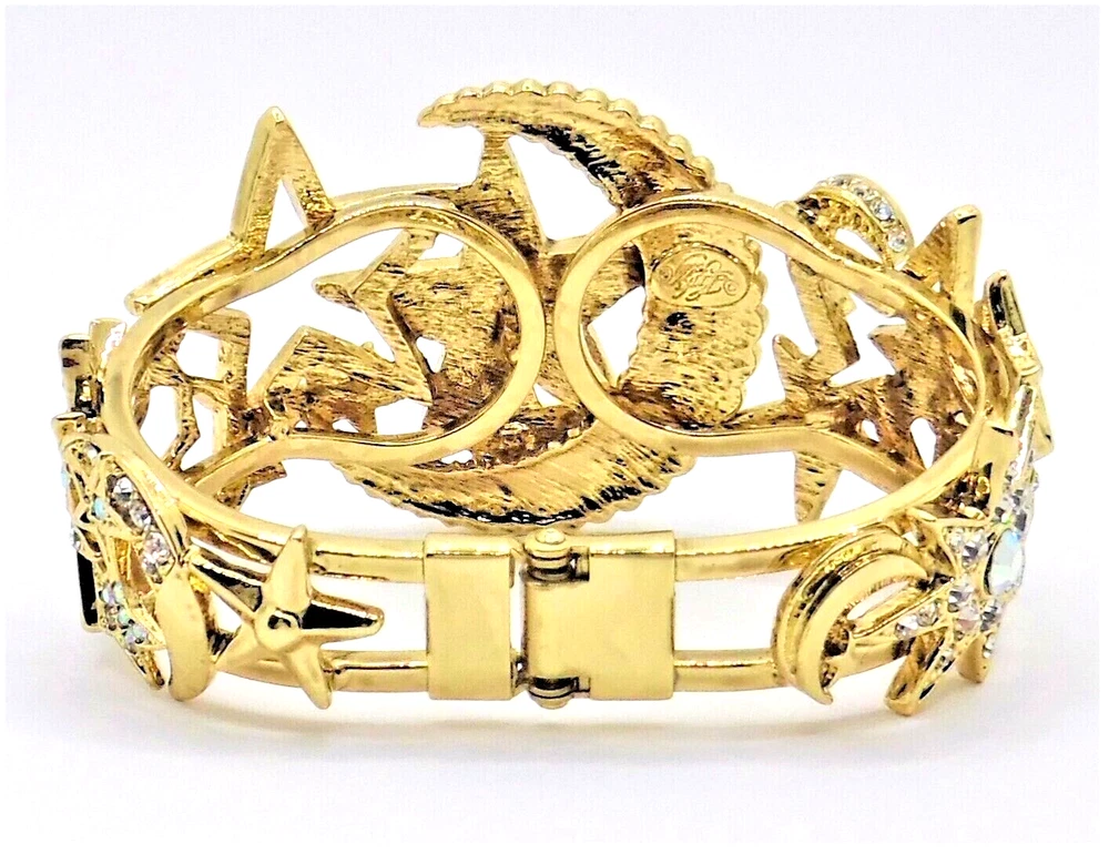 Kirks Folly MOON MAGIC Hinged Bangle Bracelet. Approximate measurements: Inside diameter- 1-3/4" height x 2-1/2" wide. Top face width 1-3/4". Aurora borealis crystals, plated gold-tone finish. Clamper closure. Comes in Kirks Folly Box.