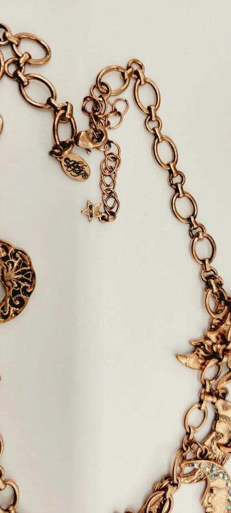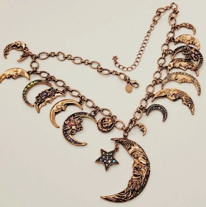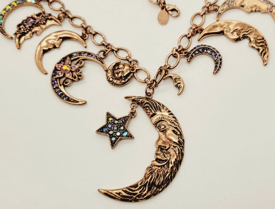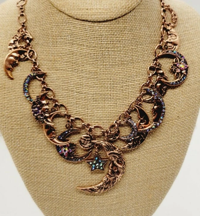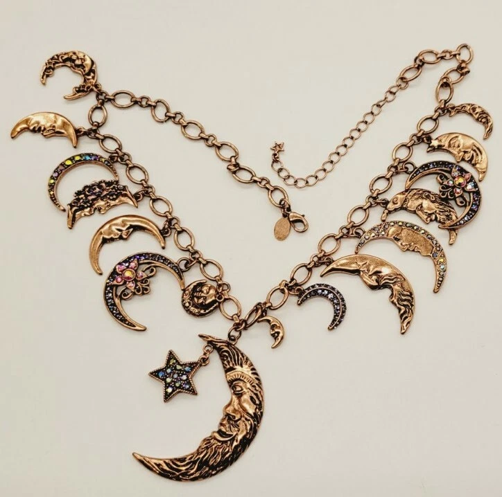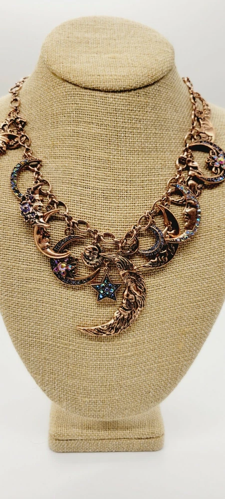 You don't have to move heaven and earth to enchant with this sparkling, conversation-starting charm necklace. Part of the Kirks Folly Moon Shadow Collection depicting our unity under the sky, each finely detailed moon face displays a look worthy of a time-treasured story. From Kirks Folly. Oval link chain; various sizes of moon charms with aurora borealis crystals, including black, clear, pink, and blue; purple epoxy enamel accents; oxidized finish Multi: Copper Lobster claw clasp Approximate measurements: Necklace 18"L x 1/4"W plus a 3"L extender; Largest charm 2-1/4"L x 1-3/8"W Pre Loved Rating B+ A- Charm was Re-Attached