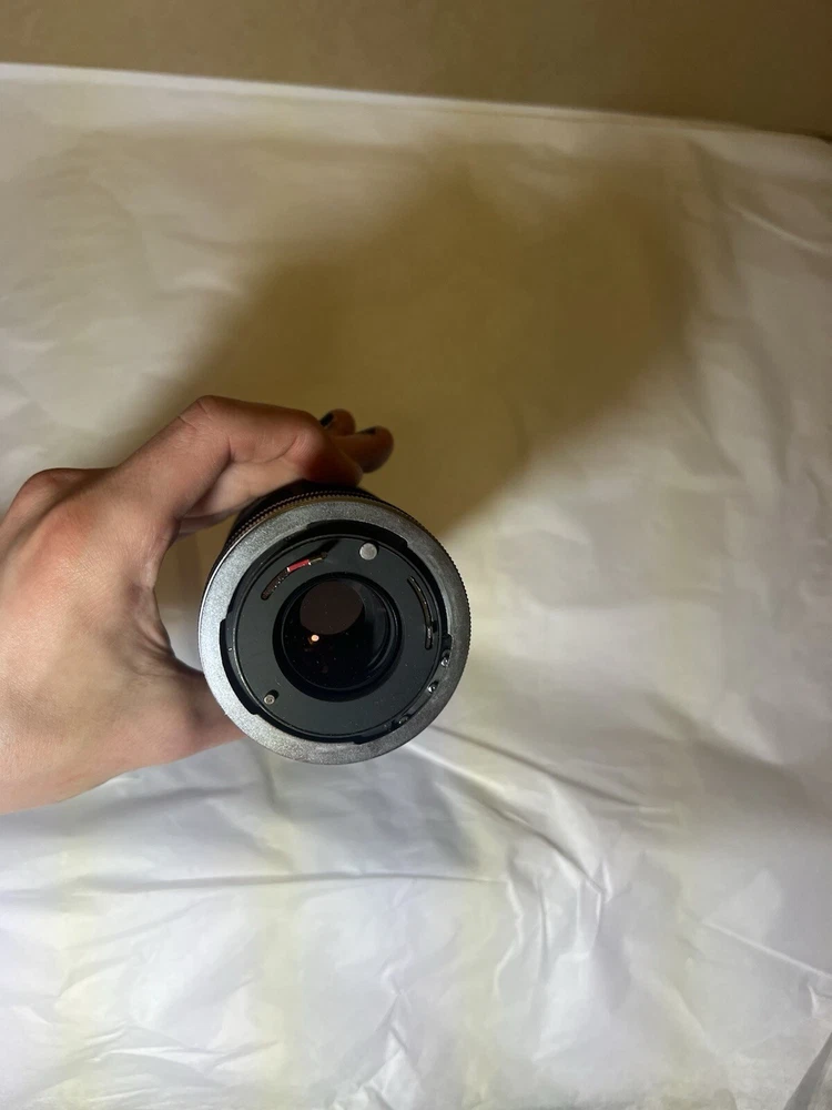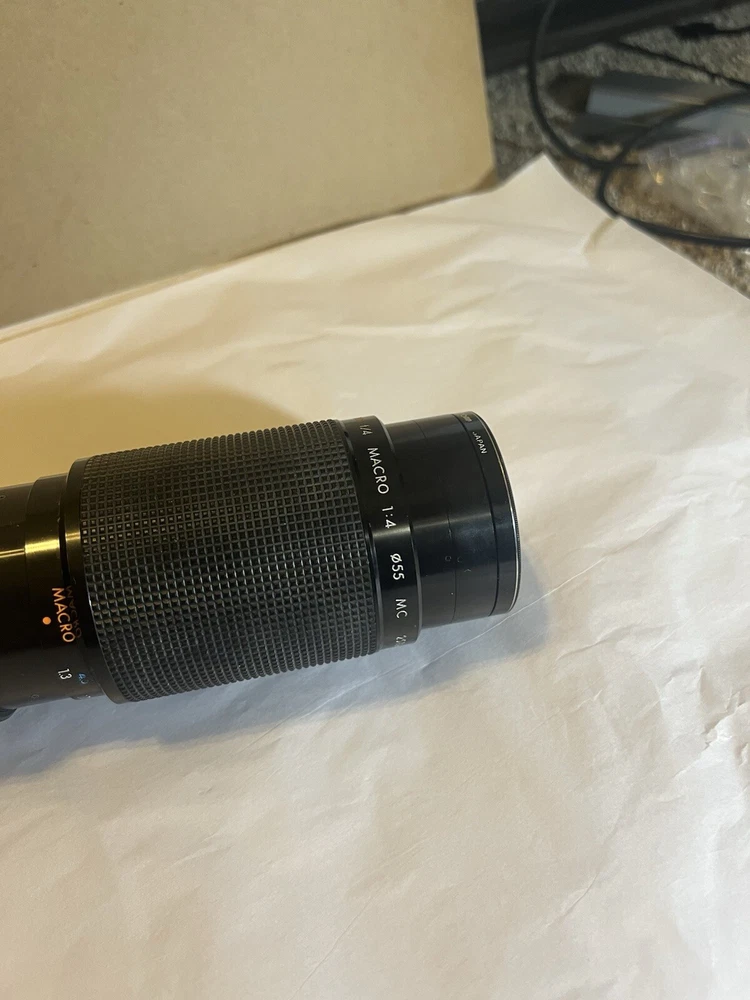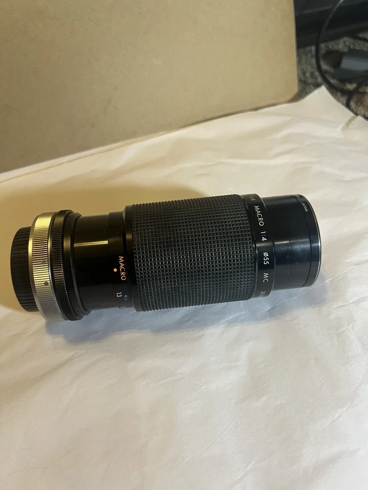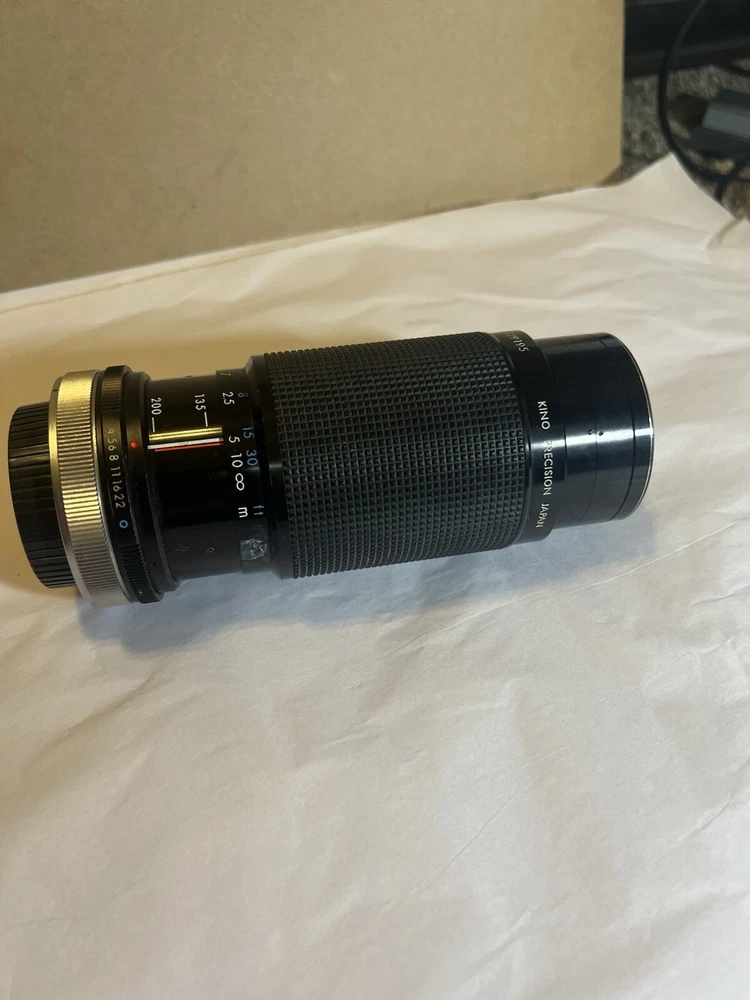 This is a Kiron telephoto zoom lens designed for Nikon cameras with a focal length range of 80-200mm and a maximum aperture of f/4.5. It has a macro/close-up feature, manual focus, and is part of the Nikon AI-S series. The lens is compatible with 55mm filters and has a Nikon F mount. Note: the inner lens has a few small smudges that I am unable to clean on my own.