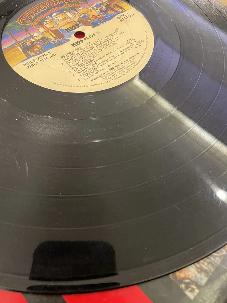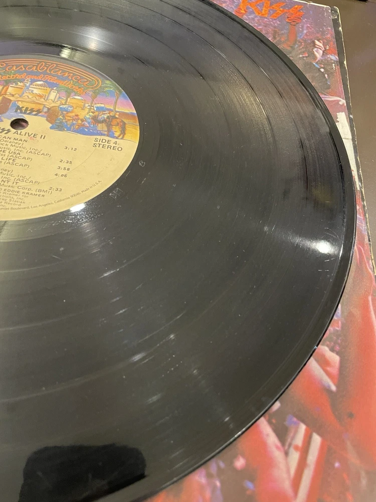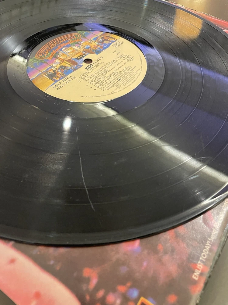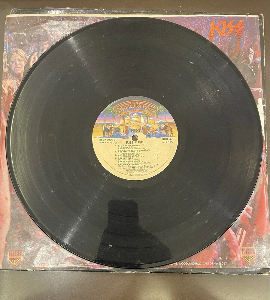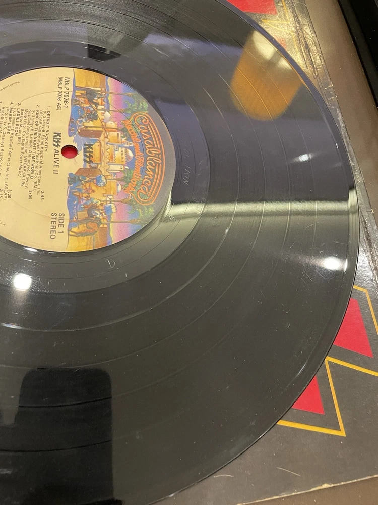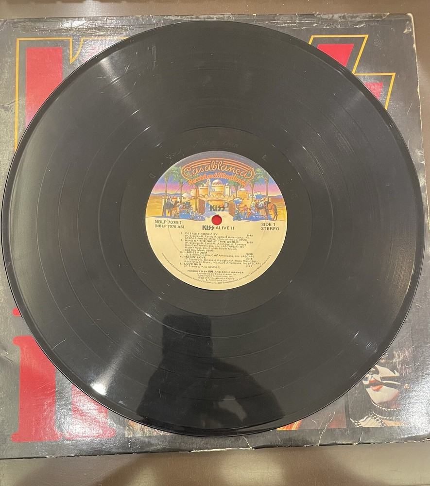 Alive II is a classic rock and hard rock double LP by Kiss. It features live recordings from their 1977 tour and includes the original cover and inner sleeve. The vinyl is black and has a speed of 33 RPM. The cardboard sleeve has a very good plus grading and the vinyl has a good plus grading. The record label is Casablanca Records and the release title is Alive II. This is the first pressing of the album and has a release year of 1977. The country of manufacture is the United States and the language is English. *Skipping: first two tracks side 1, first 3 tracks side 4