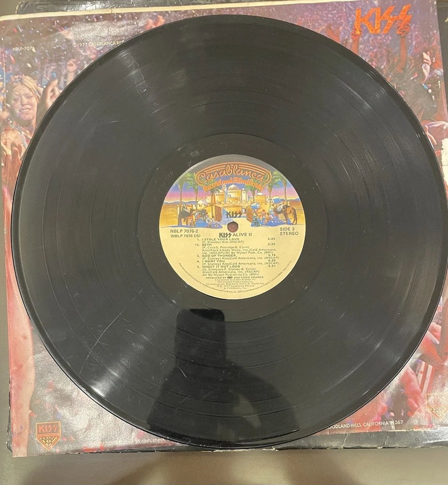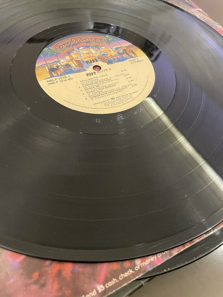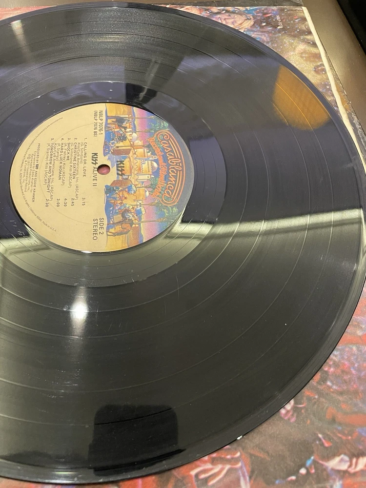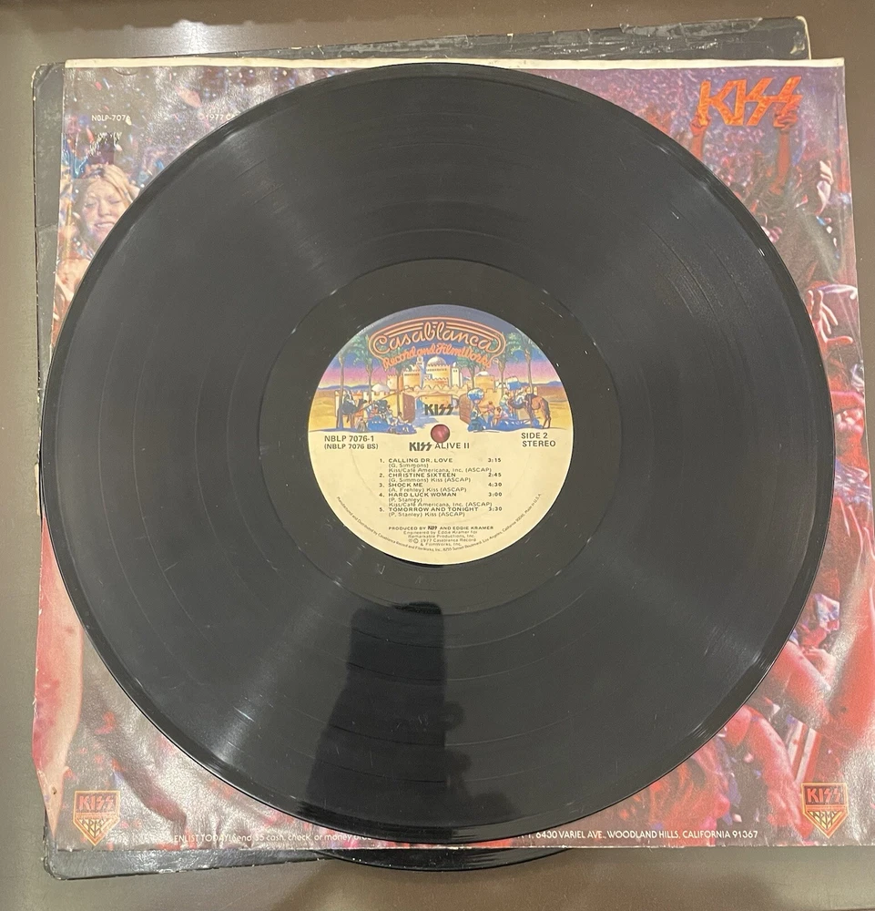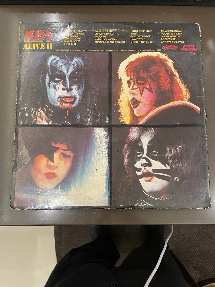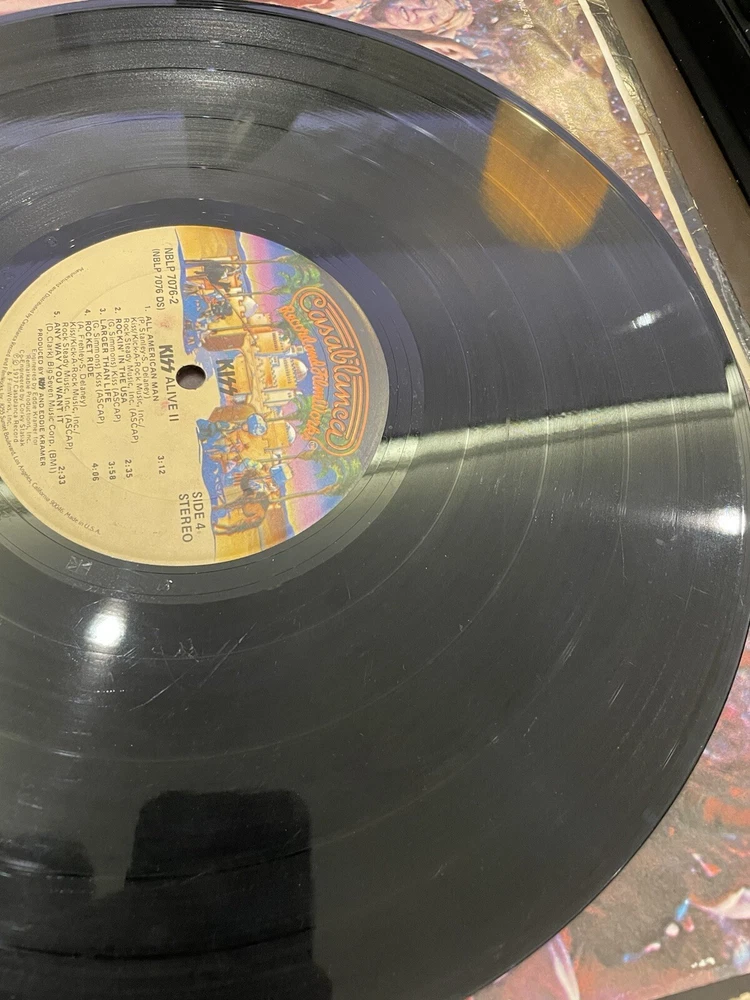 Alive II is a classic rock and hard rock double LP by Kiss. It features live recordings from their 1977 tour and includes the original cover and inner sleeve. The vinyl is black and has a speed of 33 RPM. The cardboard sleeve has a very good plus grading and the vinyl has a good plus grading. The record label is Casablanca Records and the release title is Alive II. This is the first pressing of the album and has a release year of 1977. The country of manufacture is the United States and the language is English. *Skipping: first two tracks side 1, first 3 tracks side 4