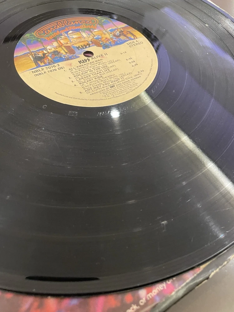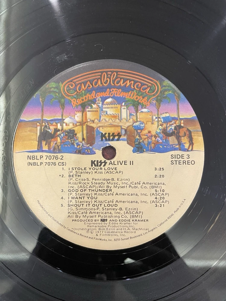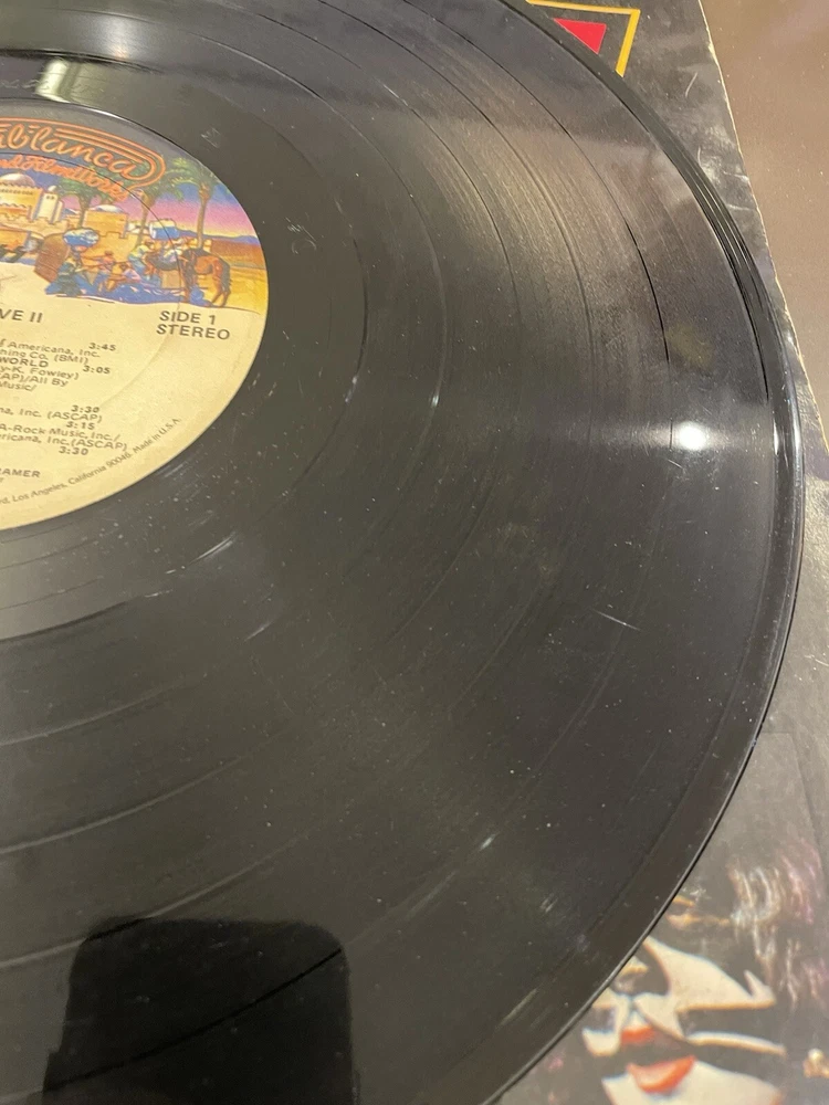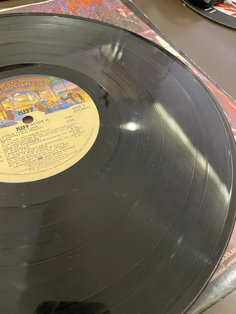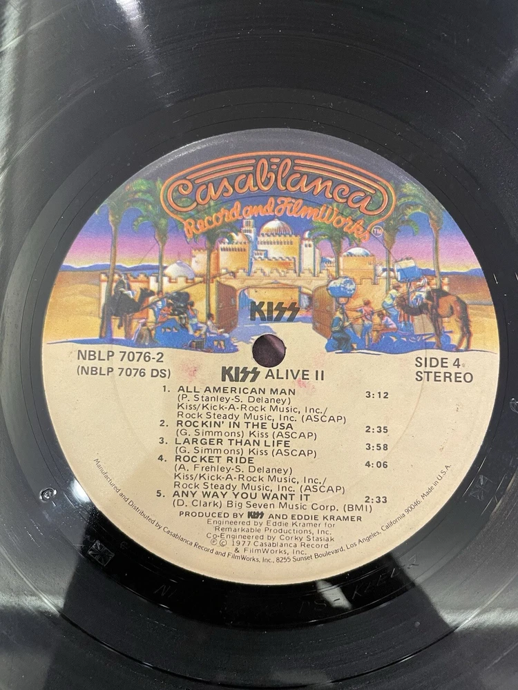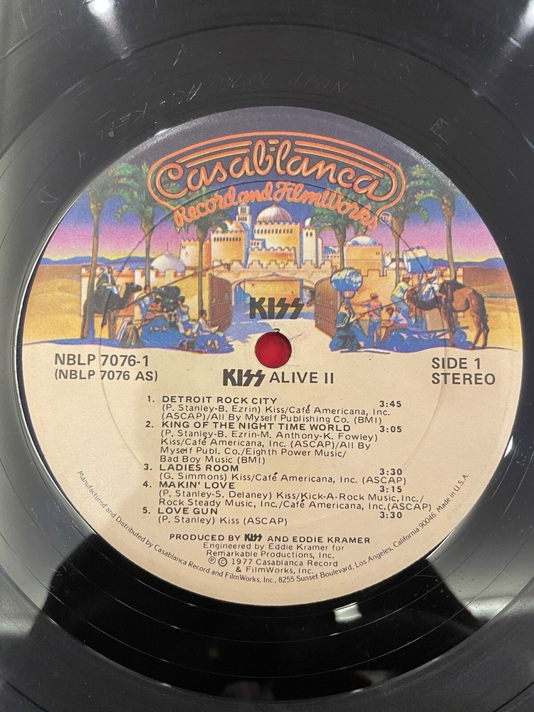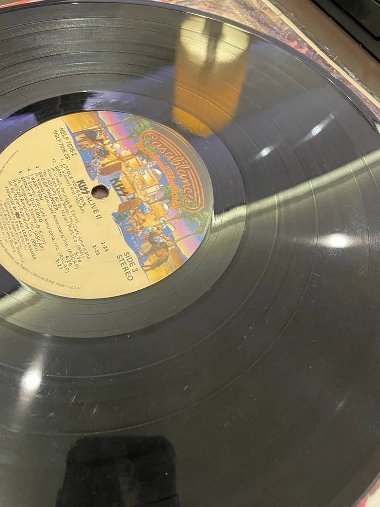 Alive II is a classic rock and hard rock double LP by Kiss. It features live recordings from their 1977 tour and includes the original cover and inner sleeve. The vinyl is black and has a speed of 33 RPM. The cardboard sleeve has a very good plus grading and the vinyl has a good plus grading. The record label is Casablanca Records and the release title is Alive II. This is the first pressing of the album and has a release year of 1977. The country of manufacture is the United States and the language is English. *Skipping: first two tracks side 1, first 3 tracks side 4