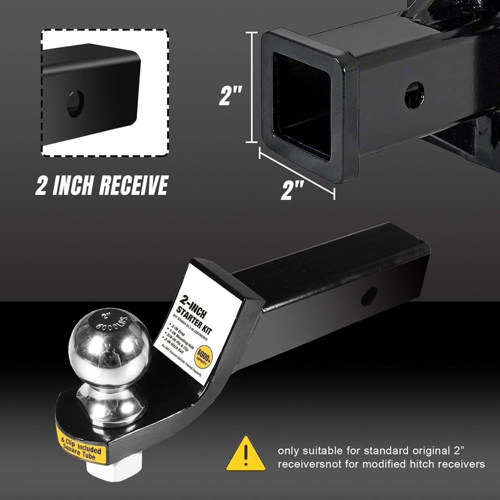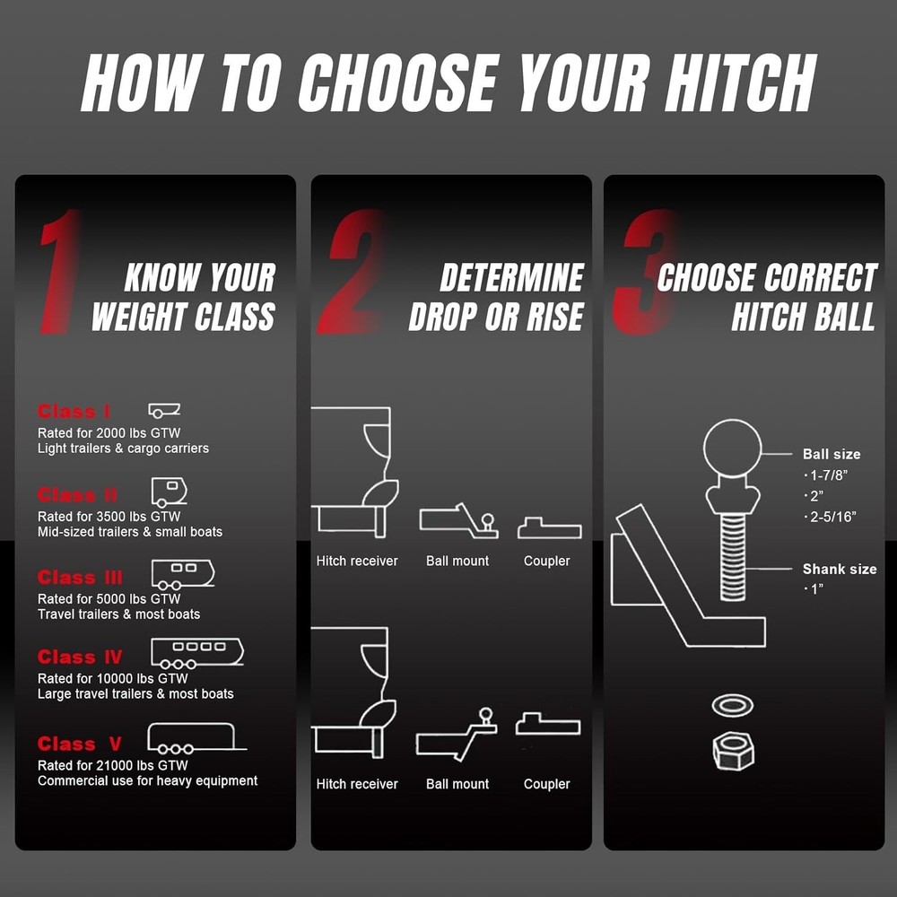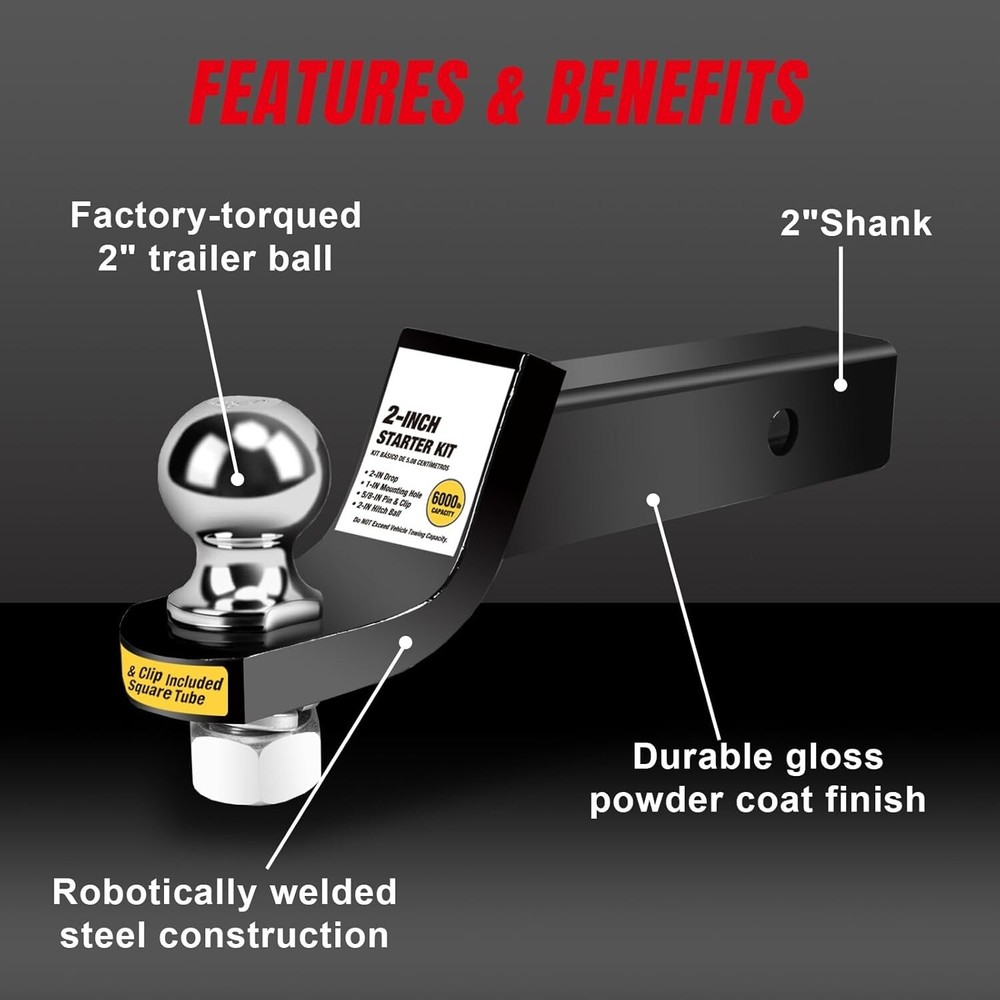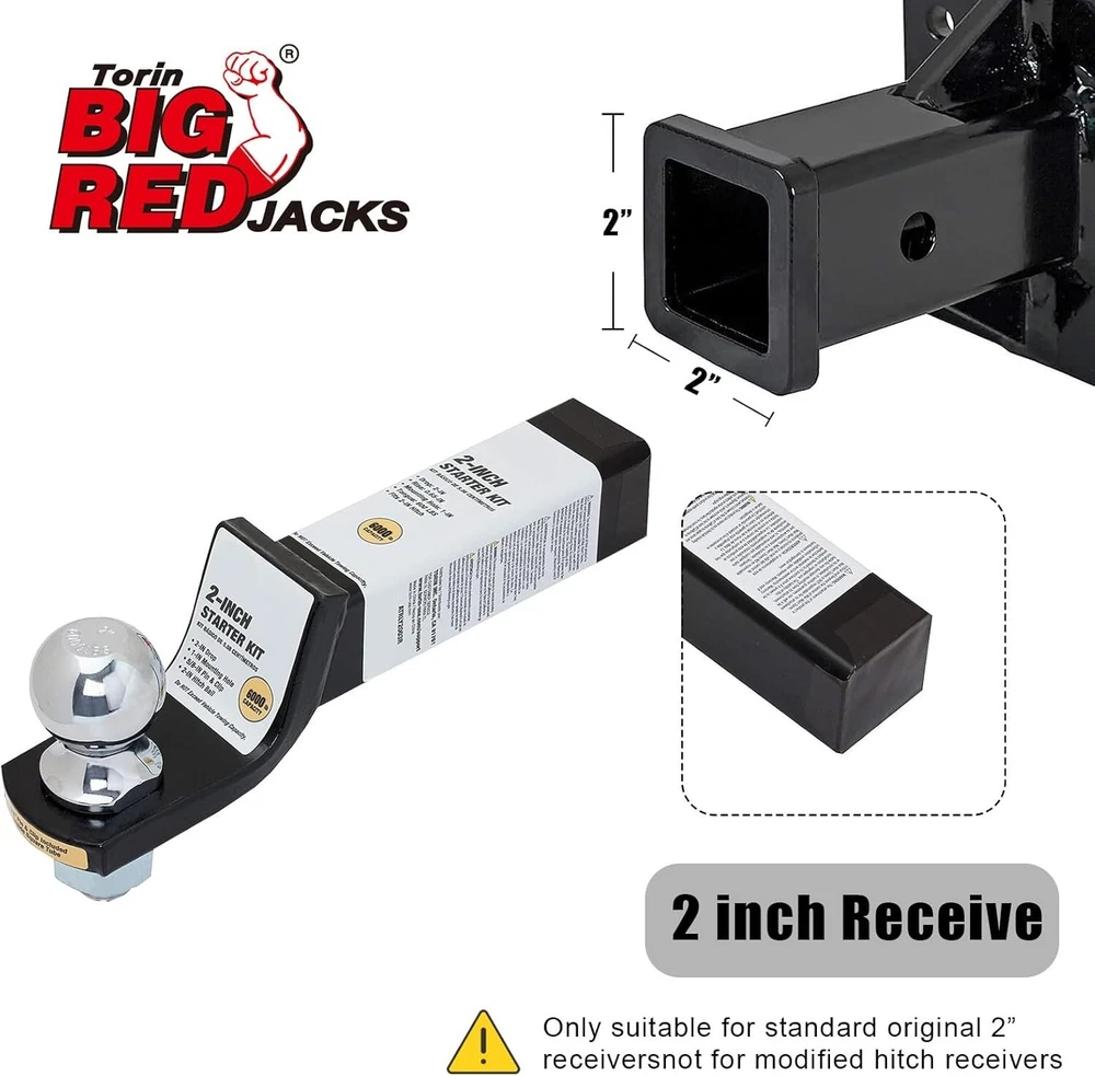 BIG RED ATRLY2003R-1 Trailer Hitch Mount and Ball: 2 Inch Ball/Reciever Compatible, 6,000 lb. Capacity About this item Constructed of heavy duty steel and protected with a powder coat finish; Trailer ball has a polished chrome plating to prevent corrosion Trailer hitch mount and ball delivers dependability for your towing setup, rated to tow 6,000 lbs. gross trailer weight and 600 pounds tongue weight Measures 8-1/4" overall length; Includes a limited 1 year manufacturer warranty Easy to be installed, simply insert the shank into your vehicle's 2" hitch receiver then connect the two vehicles with the trailer ball Ball mount has a 2" drop; Ball's diameter measures 2"; Pin hole is 5/8"