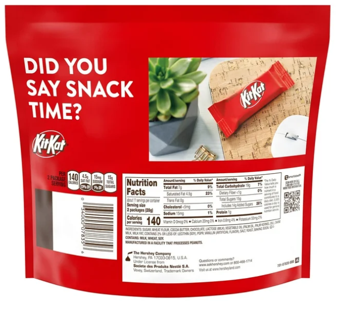 Kit Kat Milk Chocolate Wafer Snack Size Candy, Bag 10.78 oz About this item Product details Ready for a classic everyone hopes to find in the candy dish? These snack size KIT KAT milk chocolate wafer candy bars are individually wrapped for optimal convenience, easy sharing and lasting freshness. Whether you gift them to friends, pass them out in the office or hold onto them for snacking moments, you can expect a delicious treat in the perfect on-the-go size. Throw a few in your lunch box to treat yourself to a sweet dessert or stock your home and office candy bowls with an easy snacking classic. Contains one (1) 10.78-ounce bag of KIT KAT Milk Chocolate Wafer Snack Size Candy Bars Fill snack drawers, lunch boxes and candy dishes all year long with milk chocolate and wafer KIT KAT candy bars Kosher certified, snack size milk chocolate wafer candy bars individually wrapped for lasting freshness and convenience Be the biggest hit at the birthday, anniversary, retirement, graduation, new baby or wedding party with classic milk chocolate wafer candy everyone there knows and loves Place a whole or chopped KIT KAT candy bar on top of any cookies or brownies you bake for an extra sweet treat sure to become everyone's new favorite Specifications Food Allergen Statements Contains Wheat, Soy, Milk Food Form Whole Brand KITKAT