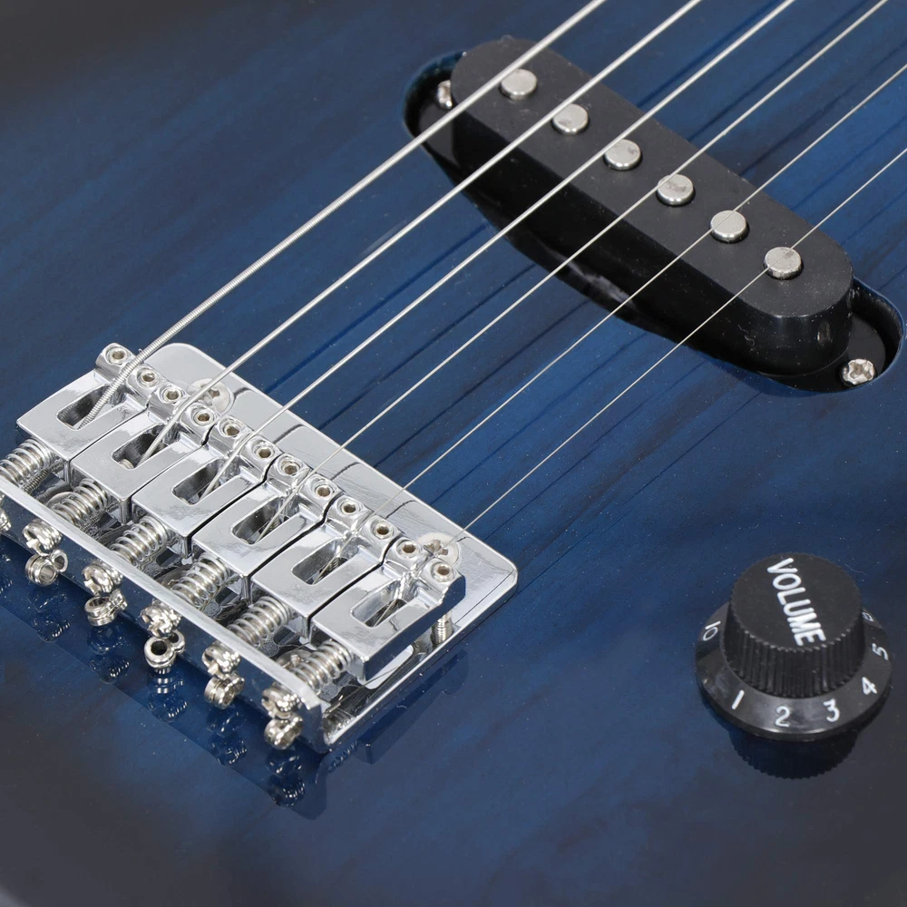 Beyond Toys: Choosing a Great Beginner Guitar for Kids Picking a starter guitar often involves juggling your budget with your kid’s expectations. To learn the instrument, buying something expensive and an equally costly premium amp is not necessary. Instead, it’s worth opting for a beginner’s guitar or a convenient and affordable combo pack. starter kit contains everything your need to get your kids up and playing instantly, including a guitar, an amp, a cable, strap, plectrums and additional strings set, at a price anyone can afford. Our Electric Guitar is a brand new 30"functional Electric Guitar. Good quality, beautiful surface especially the perfect size make it an ideal choice for your kids. It is lightweight and easy to carry. 30” scale is easier for small hands to manage. All accessories you need to start playing the guitar right away are included. This combo is perfect for kids and would make a great gift. The guitar holds tune very well but if you live in an area where temps and humidity changes a lot, so tuning will be a constant. Features: 30" Full size electric guitar Guitar Dimensions: 30"(L) x 10.4"(W) x 3.6"(H) Painting Surface: Polished Body: hardwood Finger board: rose wood Machine Heads: Chrome Diecast AMP Specifications: Amp Dimensions: 5"(L) x 2.5"(W) x 5"(H) 5 watts Two band EQ Volume, base tone and treble control Headphone out Package Include: 1 x 30'' electric gutiar 1 x 5 watt amplifier 1 x 420D bag 1 x guitar strap 1 x guitar cable 1 x additional strings set +1#additional string 2 x pick 1 x allen key Warm note: Recommended for children 3 years and up No assembly required It's 9V battery for the 5W amp( Battery not included) Any other question please feel free to contact seller first! We will be more than happy to help you! Recommended for children 3 years and up, this mini electric guitar set has an attractive blue color and smooth finish. The blue finish over wood grain is a very appealing effect you don't see often, and the light wood neck stands out against the dark blue body to make for a beautiful guitar. Made with a hardwood body and rosewood fretboard (22 frets); The strings are easy to press down on, passive electronics for a rich, full sound. Our guitars are brand new electric guitars, please adjust the settings and tune it before playing. Comes with a cable cord, convenient amp strap, guitar picks, and a mini amp (5 watt) that can be clipped on to your kid’s clothing; Portable amp needs only one 9 volt battery(battery is not included). Guitar length: 30” (L), Amp Dimensions: 5"(L) x 2.5"(W) x 5"(H), a nylon guitar case is included for storage and easy carry. For the aspiring guitarist in your family, you can not beat this deal! Kind Reminder: Amp is only compatible with adapter with negative electrode'-’inside, positive electrode '+’outside, otherwise it would cause short or fire. If you have a smart phone or tablet, you can download a electronic tuner to make tuning much easier.