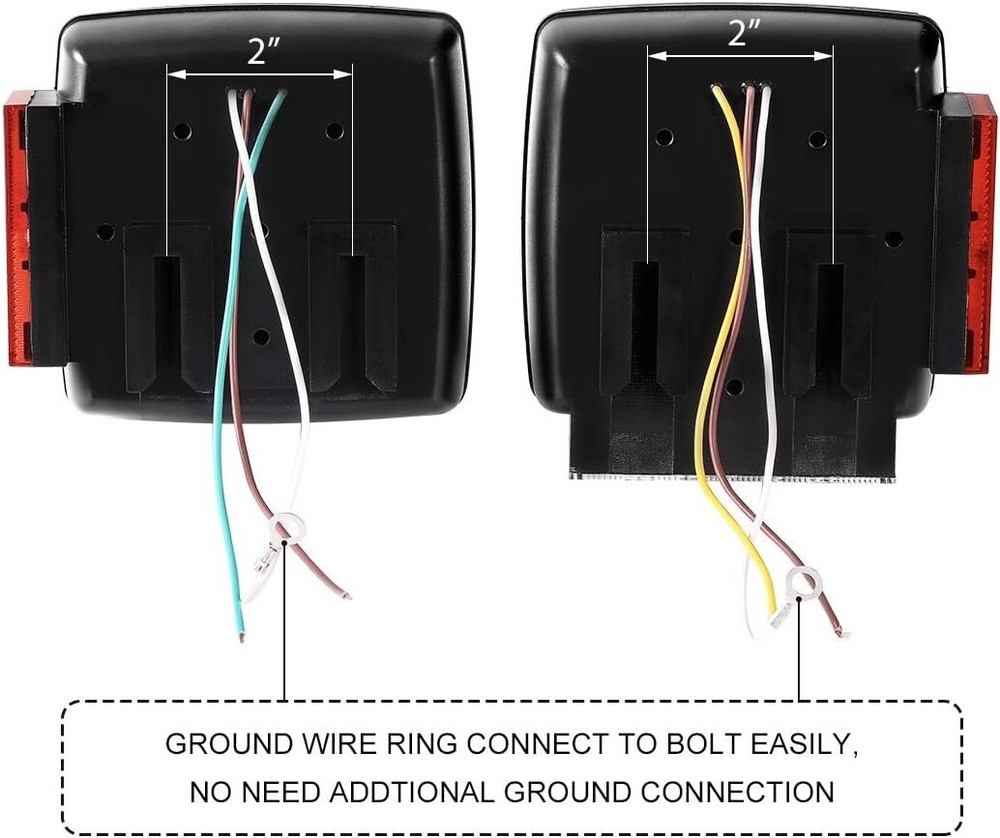 Las luces traseras izquierda y derecha para remolque tienen 7 funciones: freno, giro, cola, reflector trasero, reflector lateral, luz de posición lateral y luz de matrícula. Las luces LED para remolque son aptas para vehículos de remolque de menos de 80 pulgadas de ancho, como barcos, remolques utilitarios, camiones, motos de nieve, etc. El arnés de cables de cobre puro 100 % de calibre 18 garantiza un buen funcionamiento de las luces LED para remolque bajo el agua. Todos los diodos son LED, no bombillas incandescentes. Se realiza una inspección de calidad 100 % antes del envío, incluyendo una inspección fotométrica. ¡Las luces LED para remolque marino ofrecen una visibilidad excepcional y una mayor vida útil! Las luces traseras impermeables para remolque cumplen con la certificación DOT FMVSS108. Excelentes luces impermeables/sumergibles para remolques de barcos. La tecnología de sellado por soldadura sónica garantiza la solidez del sellado de las luces traseras. Todos los huecos posibles, como los orificios de entrada de los cables y el borde de la lente, están bien sellados con pegamento de grado marino. Fácil instalación de las luces sumergibles para remolque. Asegúrese de conectar el cableado y de que no haya cortocircuitos antes de su uso en condiciones marinas/submarinas. El diagrama de cableado se incluye con las luces del remolque; también puede encontrarlo en la hoja de instrucciones.