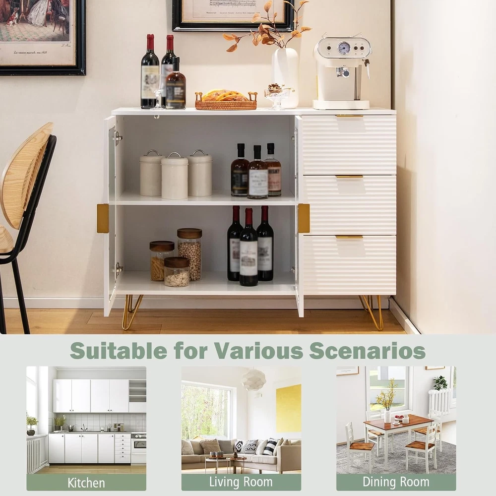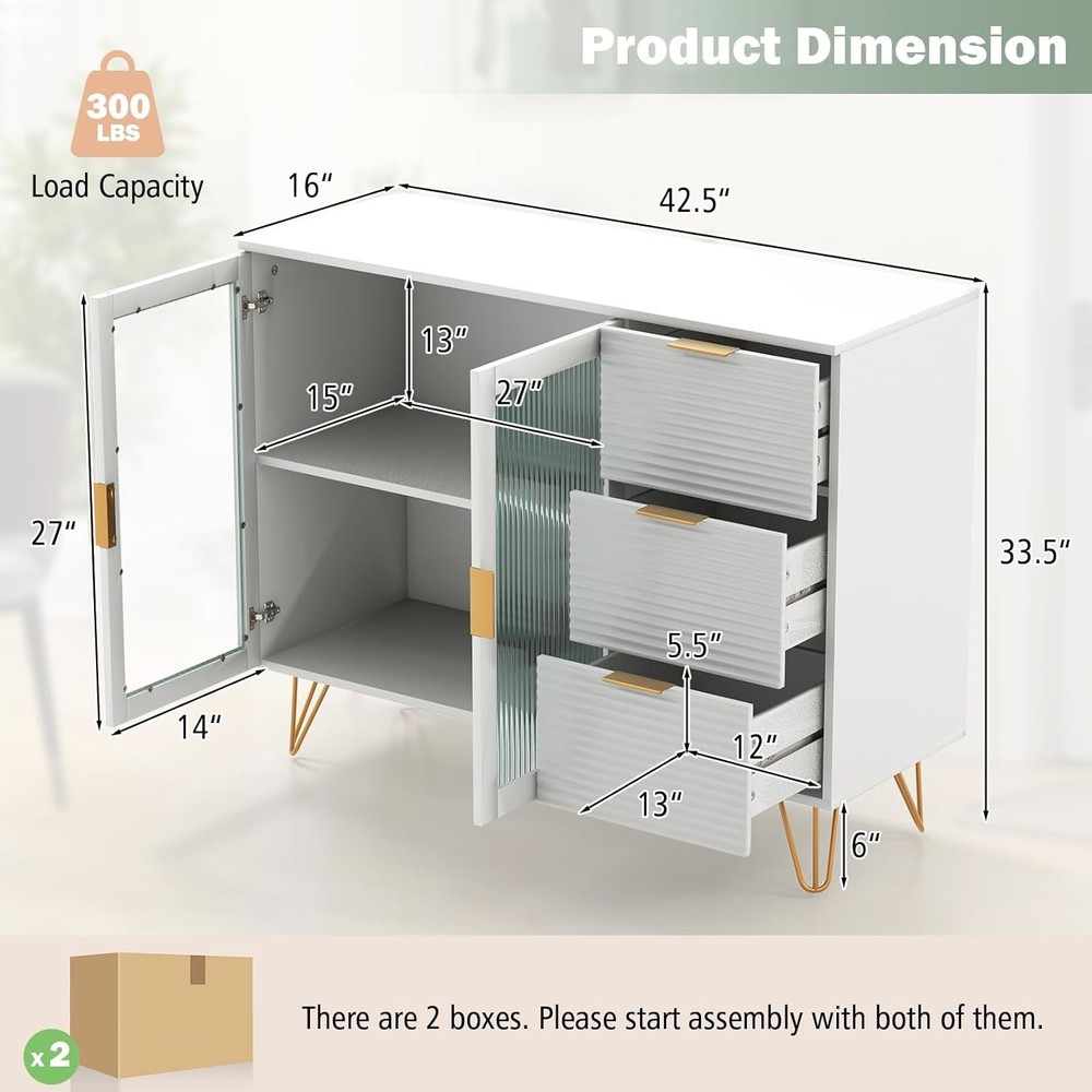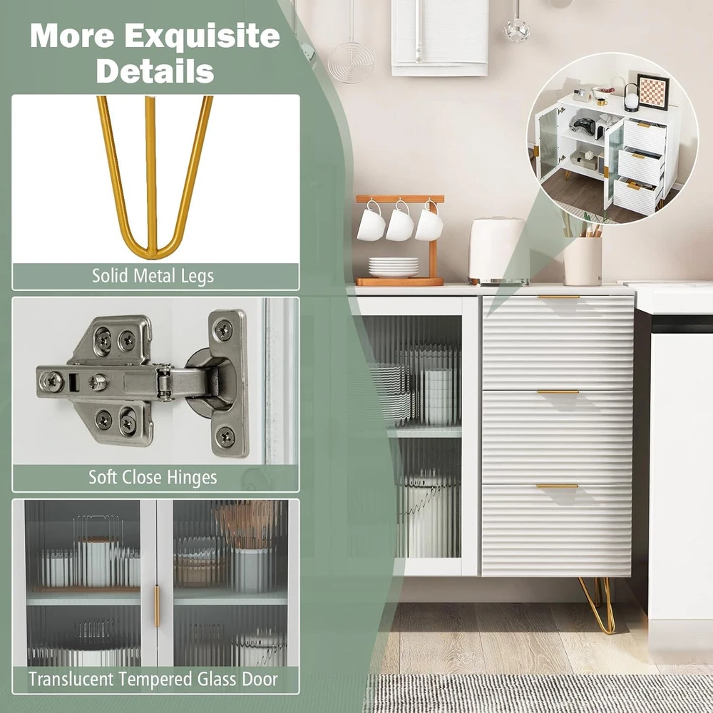 Product Description About this item Ample Storage Space: This kitchen storage cabinet comes with 3 large drawers and a 2-tier storage cabinet, offering generous storage for your household appliances, dinnerware, kitchenware, seasoning, wine, and glass. Besides, the top of the cabinet can also hold decorative items such as potted plants and photo frames. Durable & Safe Use: This buffet server sideboard is made of high quality board with painted surface, which is sturdy and stable for long time use. In addition, the anti-toppling device is served to attach the cabinet to the wall to prevent tipping over or wobbling. Suitable for Various Scenarios: Featuring a modern and elegant style appearance, this kitchen storage organizer seamlessly fits into any space, from the kitchen to the living room and dining room, keeping your belongings organized and within easy reach. More Exquisite Details: Elevate your space with solid metal legs, soft close hinges, and a sleek translucent tempered glass door. These thoughtful details not only enhance the cabinet's appearance but also ensure durability and functionality. Easy Assembly & Simple Clean-up: With simple instructions and provided hardware, this storage cabinet is a breeze to set up. Plus, its smooth surfaces make maintenance quick and effortless, which only needs to wipe it with a soft cloth. Description: Are you looking for a large and elegant kitchen storage organizer? Look no further than our storage cabinet. With its abundance of storage space, our kitchen storage cabinet is perfect for anyone who wants to keep their belongings organized and within easy reach. It comes with 3 large drawers, a 2-tier storage cabinet as well as a large tabletop. Whether you need a place to store your kitchen appliances, dinnerware, or even decorative items, this cabinet has got you covered. Besides, its durable construction ensures that it will stand the test of time, while the anti-toppling device provides extra safety and stability. Plus, the sleek translucent tempered glass doors and elegant metal legs endows this cabinet with elegant appearance, which makes it as a perfect addition to kitchen, living room and dining room. Features: 3 large drawers keep different kinds of goods organized Wide cabinet top convenient to get frequently-used kitchen utensils 2-tier storage cabinet helps to store private and fragile items Made of high-quality board with a painted surface for durability Anti-toppling device ensures safe use by attaching the cabinet to the wall The sleek translucent door endows the cabinet with elegant appearance Solid metal legs and reinforced hinges add extra stability to this cabinet Easy clean-up with smooth surfaces that can be wiped clean with a soft cloth Specifications: Color: White, Gold Material: Engineered Wood, MDF, Metal Overall Dimension: 42.5” x 16” x 33.5” (L x W x H) Drawer Dimension: 13” x 12” x 5.5” (L x W x H) Storage Shelf Dimension: 27” x 15” x 13” (L x W x H) Tabletop Dimension: 42.5” x 16” (L x W) Cabinet Doors Dimension: 27” x 14” (L x W) Net Weight: 82.5 Ibs Load Capacity: 300 lbs Package includes: 1 x Storage Cabinet 1 x User Guide On Aug 14, 2025 at 21:35:59 PDT, seller added the following information: