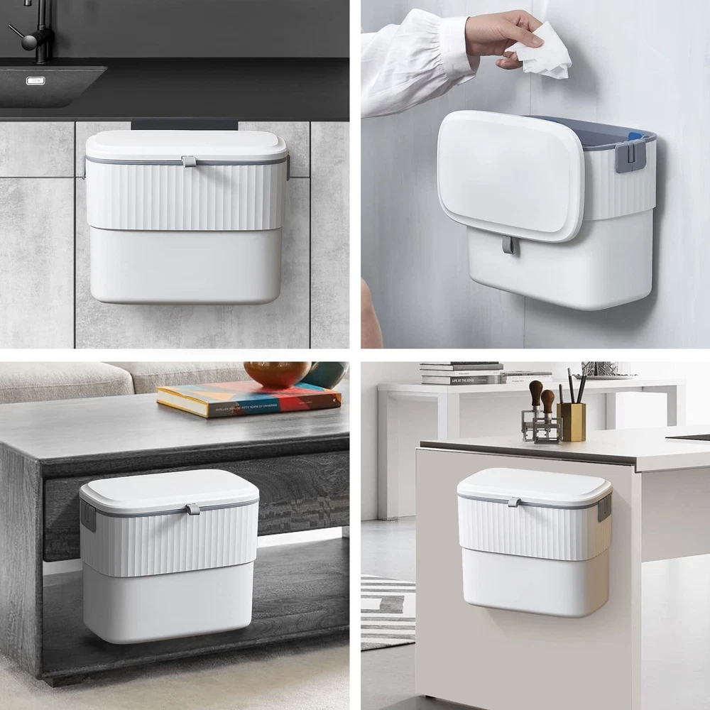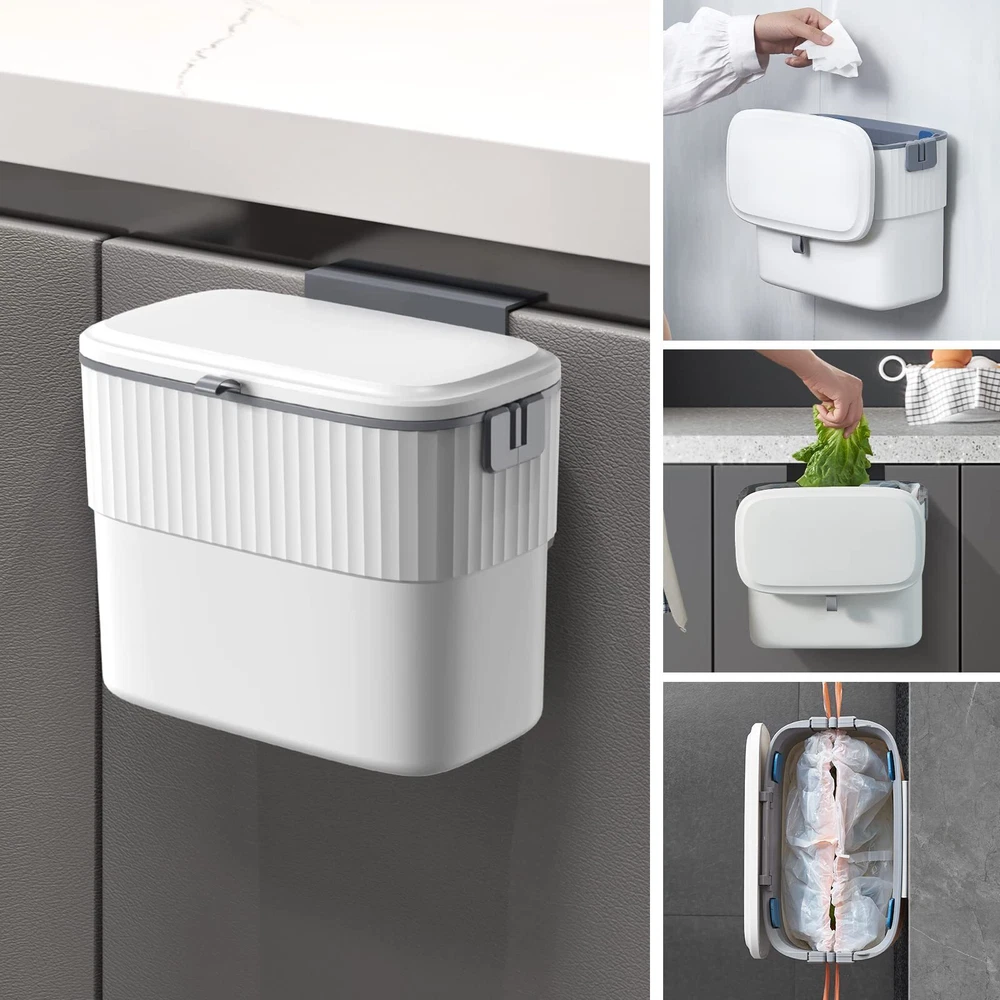 Wall-mounted/Hanging Trash Can - This trash can has two different types of support components, both of which are easy to install, and you can install them in any position you find most comfortable. The one with adhesive strip on the back is for customers to place on a flat and clean vertical surface like bathroom wall. The other one can be hung on both sides of any cabinet door that is not thicker than 1 inch. Four Rubber Flaps - Mountable garbage cans come with elastic soft rubber device can effectively prevent the phenomenon of garbage bags slipping because of heavy garbage, and can help invisible garbage bags, so that the garbage cans look more beautiful at a glance. Drawstring Design - The hanging garbage cans come with a convenient drawstring design that allows you to quickly pack garbage bags without getting your hands dirty, and the built-in spring makes it easy to pull the bags without tearing them. 1.8 Gallon Wide Application - The 1.8 gallon trash can is compact in appearance but holds a certain amount of trash and fits perfectly into most cabinet doors, pantry doors and cupboards, not only saving you a lot of space but allowing you to easily throw your trash without bending down, whether in the bathroom, kitchen, bedroom, camper, RV and other small spaces, adding convenience and beauty to your life. (10.5''L x 6''W x 8.5''H) Smooth Opening Cover - Just gently pull back the rubber pull ring of this wall-mounted garbage can to open the lid, do not worry about the lid will be stuck in the process of pulling, smooth as can be.