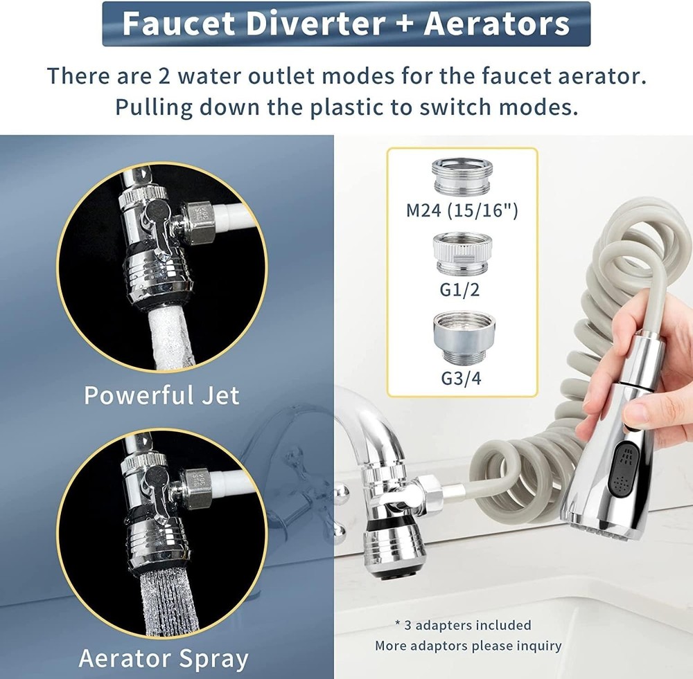 Kitchen Faucet Attachment Set with On/Off Control for Versatile Use ‹ › ‹ › ‹ › ‹ › ‹ › ‹ › ‹ › ‹ › ‹ › ‹ › Kitchen Faucet Attachment Set Transform your kitchen into a multi-functional oasis with our Kitchen Faucet Attachment Set, expertly designed for versatility and ease of use. This set will elevate your daily kitchen tasks and give your home a touch of luxury. Features: Complete Sink Faucet Sprayer Set: Includes all components needed to attach the faucet sprayer to any sink faucet in your bathroom, kitchen, utility, laundry, or basement room. 2 Mode Shower & On/Off SWITCH: Enjoy a Handheld kitchen faucet with a sprayer head that offers two water flow modes - the gentle Bubble Spray and powerful Power Jet, perfect for flushing away food debris and enhancing your washing experience. Faucet Aerator & 3-Way Diverter: Switch effortlessly between a soft bubble stream and a strong spray with the Brass construction Valve with 1 water inlet and 2 outlets included. Adaptable for various faucet types with included adapters. 6.6 FT Flexible Faucet Sprayer: Made of , non-toxic, explosion-proof material, the elastic telescopic hose extends up to 6.6 feet for easy . Perfect for cleaning large items or reaching remote corners, while the flexible design prevents it from falling on the floor. Easy To Install: No need for a plumber! Easily install by removing your current aerator and connecting our Dual-function Faucet Aerator with 3-Way Valve. Benefits: Elevates your kitchen experience with a dual-function sprayer. Convenient water flow control with a simple On/Off switch. Reduces cleanup time with powerful water spray. Flexible hose allows easy access without restriction. Versatile design suitable for a variety of faucets and uses. Why Choose Our Kitchen Faucet Attachment Set? Say goodbye to mundane kitchen tasks! With our Kitchen Faucet Attachment Set, you can upgrade your faucet and enhance your cleaning efficiency in one simple step. This attachment not only simplifies washing dishes but also makes bath time for pets a breeze. The ergonomic design and construction ensure a long-lasting, high-quality addition to your home. Elevate your lifestyle - order your Kitchen Faucet Attachment Set today! Shipping Free & Fast Shipping - We offer free shipping to most of the USA with a normal delivery time of 3-7 days. However, due to the current situation, additional delivery time (up to 3 weeks) may be required for some items. Alternative Carriers - We may use alternative carriers (e.g. USPS, FedEx, UPS, etc.) to ensure your package arrives safely and on time. Due to the use of multiple carriers, we are unable to provide a tracking number automatically. Handling Time - Orders are processed and shipped within 1-2 business days of receiving cleared payment. Shipping Restrictions - Shipping to Alaska, Hawaii, Puerto Rico, Guam, and other US territories may incur shipping charges or delivery restrictions. Please contact us before ordering, or your order can be refunded/cancelled. State Restrictions - There may be restrictions based on your state of purchase. For example, certain items may not be shipped to California due to state regulations. Contact for Tracking Updates - If you require tracking updates or have any concerns about the delivery of your order, please feel free to contact us, and we will be happy to assist you. Return 30-Day Hassle-Free Returns - We want you to be completely satisfied with your purchase. If you are not, you can return the item within 30 days of receiving it for a full refund or exchange. Easy Return Process - To start a return, simply contact us and we will provide you with a prepaid return shipping label and detailed instructions. Restocking Fee - There are no restocking fees for returns. However, the buyer is responsible for return shipping costs if the return is not due to a seller's error. Refund Processing Time - Refunds will be processed within 5 business days of receiving the returned item in its condition. Payment We accept all major credit cards, PayPal, and Apple Pay for your convenience. Your payment information is secure and encrypted to ensure a safe and seamless transaction. Please complete your payment within 3 days of purchase to avoid any delays in shipping. Feedback Your feedback is extremely important to us. We strive to provide the best products and customer service possible. If you are satisfied with your purchase, please take a moment to leave us a positive review. If you have any concerns or issues with your order, please contact us before leaving negative feedback. We are committed to resolving any problems and ensuring your satisfaction. Contact Us If you have any questions or concerns, please feel free to out to our customer support team. You can contact us through the eBay messaging system. We are available Monday to Friday, 9:00 am to 5:00 pm EST, and we will do our best to respond to your inquiry within 24 hours. Buy it now and enjoy a pleasant shopping experience! Item Weight: 0.1 kg Model: Kitchen Sink Sprayer Attachment Unit Quantity: 1 Material: Brass,Plastic Suitable For: Kitchen Sink,Bathroom,Kitchen,Utility,Laundry,Basement Room Features: Pressurized Water Saving,Water Flow Control,Bubble Spray,Power Jet,On/Off Switch,Water Saving,Flexible Hose,Easy to Install Room: Kitchen,Bathroom,Utility,Laundry,Basement Items Included: 79" stretched coil sink hose,dual-function faucet aerator,no drilling adjustable adhesive bracket,hand-held sprayer Type: Faucet Attachment Finish: Polished Number of Faucet Holes: 1 Color: Grey Number of Faucet Handles: 0 (Touchless) Faucet Mounting Type: Multi-Use Handle Type: Touchless Shape: Flexible Installation: Easy Install Item Height: 1.18 Inches Faucet Hole Spacing: Standard Style: Modern